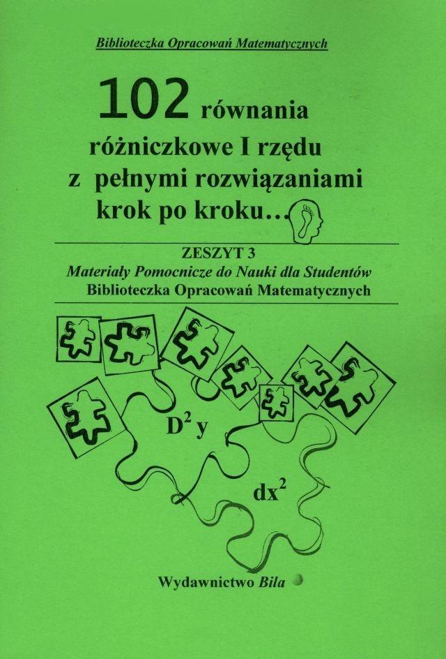 Opracowanie 102 równania różniczkowe I rzędu z pełnymi rozwiązaniami krok po kroku ma na celu prezentację metod rozwiązywania niektórych klas równań różniczkowych I rzędu. Szybsze opanowanie metodyki rozwiązywania równań różniczkowych pozwoli dokładniej skupić się na problemie opisywanym przez równanie oraz na analizie przebiegu procesów w różnych warunkach. Ze względu na obszerność zagadnienia w zeszycie 3 zaprezentowano metody rozwiązywania równań tylko pierwszego rzędu. Są tu równania o zmiennych rozdzielonych, równania jednorodne, równanie liniowe, równania Bernoulliego, Clairauta, Lagrangea, Riccatiego oraz zupełne.