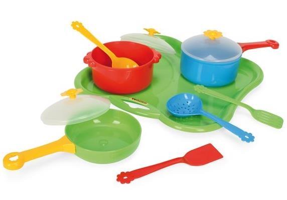 Zestaw zawiera praktyczny komplet akcesoriów kuchennych, z pomocą których rezolutny maluch przygotuje „ciepły posiłek“. Praktyczna taca, na niej garnek, rondelek, patelnia z pokrywkami i oczywiście sztućce do nakładania posiłków.