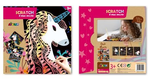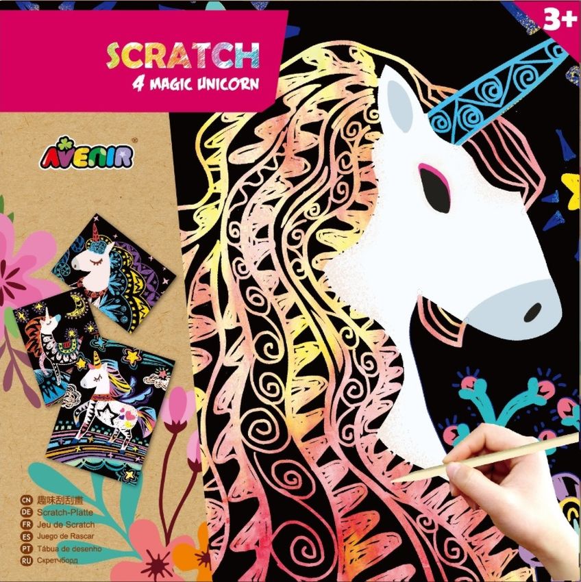 Avenir Scratch to zupełnie nowe podejście do prac ręcznych. Wyjątkowy arkusz, na którym tworzy się poprzez zdrapywanie warstwy wierzchniej, by odsłonić wielobarwną warstwę spodnią. Zabawka kreatywna najwyższych lotów, pozwalająca nie tylko tworzyć piękne prace, ale także dająca doświadczenia sensoryczne - dzięki użyciu odpowiedniego narzędzia i zachowywania się papieru podczas zabawy dziecko odbiera nowe wrażenia dotykowe. W zestawie są 4 magiczne jednorożce oraz patyczek do zdrapywania. Dla dzieci powyżej 3. roku życia. Opakowanie: 23 x 23 cm.