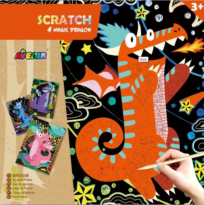 Avenir Scratch to zupełnie nowe podejście do prac ręcznych. Wyjątkowy arkusz, na którym tworzy się poprzez zdrapywanie warstwy wierzchniej, by odsłonić wielobarwną warstwę spodnią. Zabawka kreatywna najwyższych lotów, pozwalająca nie tylko tworzyć piękne prace, ale także dająca doświadczenia sensoryczne - dzięki użyciu odpowiedniego narzędzia i zachowywania się papieru podczas zabawy dziecko odbiera nowe wrażenia dotykowe. W zestawie są 4 magiczne smoki oraz patyczek do zdrapywania. Dla dzieci powyżej 3. roku życia. Opakowanie: 23 x 23 cm.