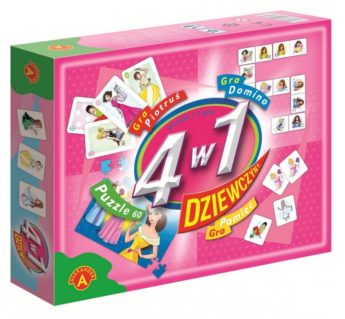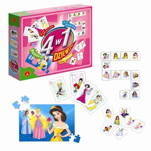 4 w 1 - dziewczyny"" to zestaw 3 różnych gier i 60 puzzli do układania.Wszystkie gry i puzzle łączy grafika o tematyce skierowanej do dziewcząt. Charakter gier jest zróżnicowany. Prosta gra w karty "" Piotruś"" wzbudzi największe zainteresowanie u najmłodszych. Gra ""Pamięć"" to dobry trening pamięci dla każdego. ""Domino"" jest również uniwersalne, grają w nie chętnie dorosli i dzieci.Puzzle, to świetne ćwiczenie spostrzegawczości, cierpliwości i skupienia.