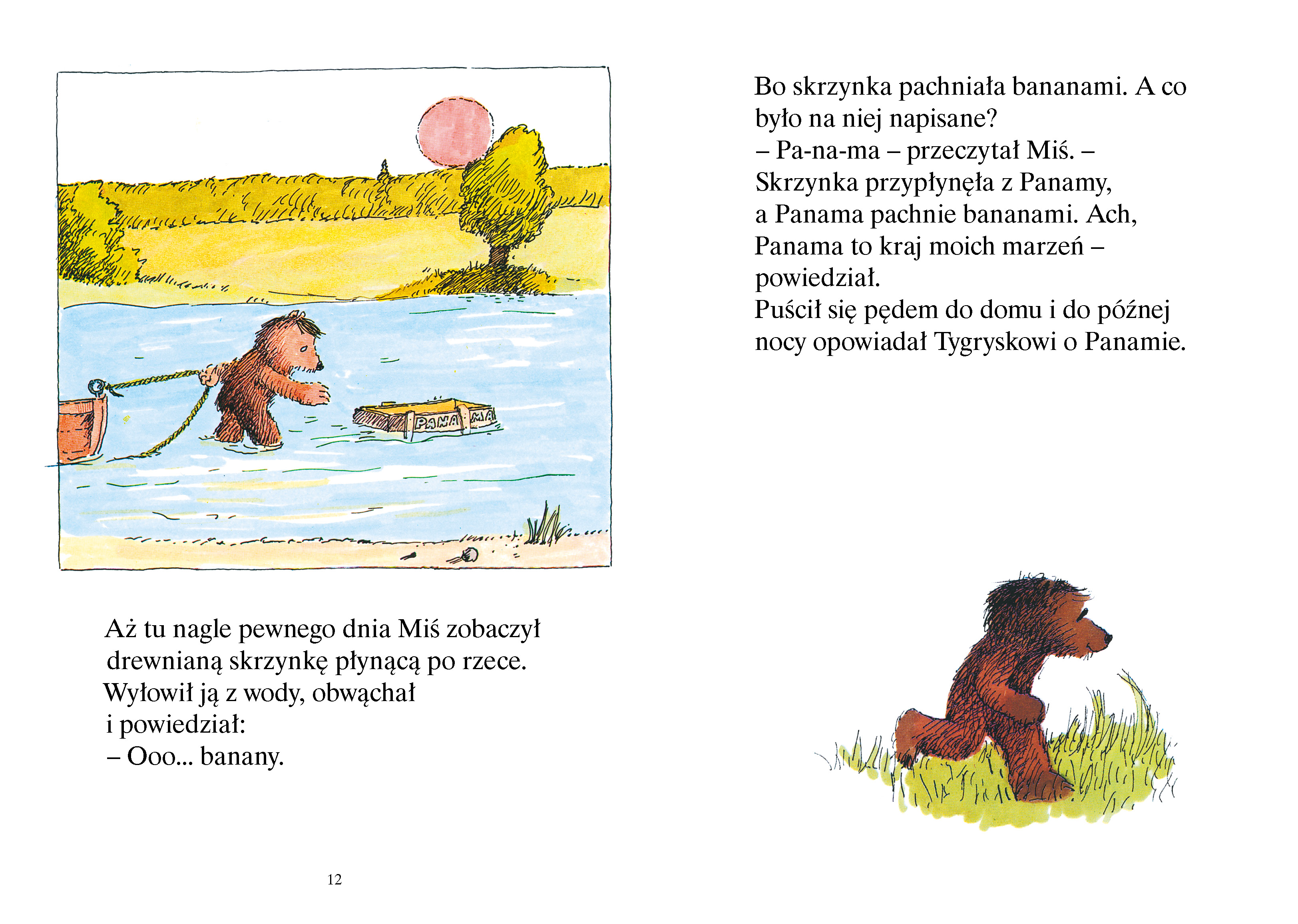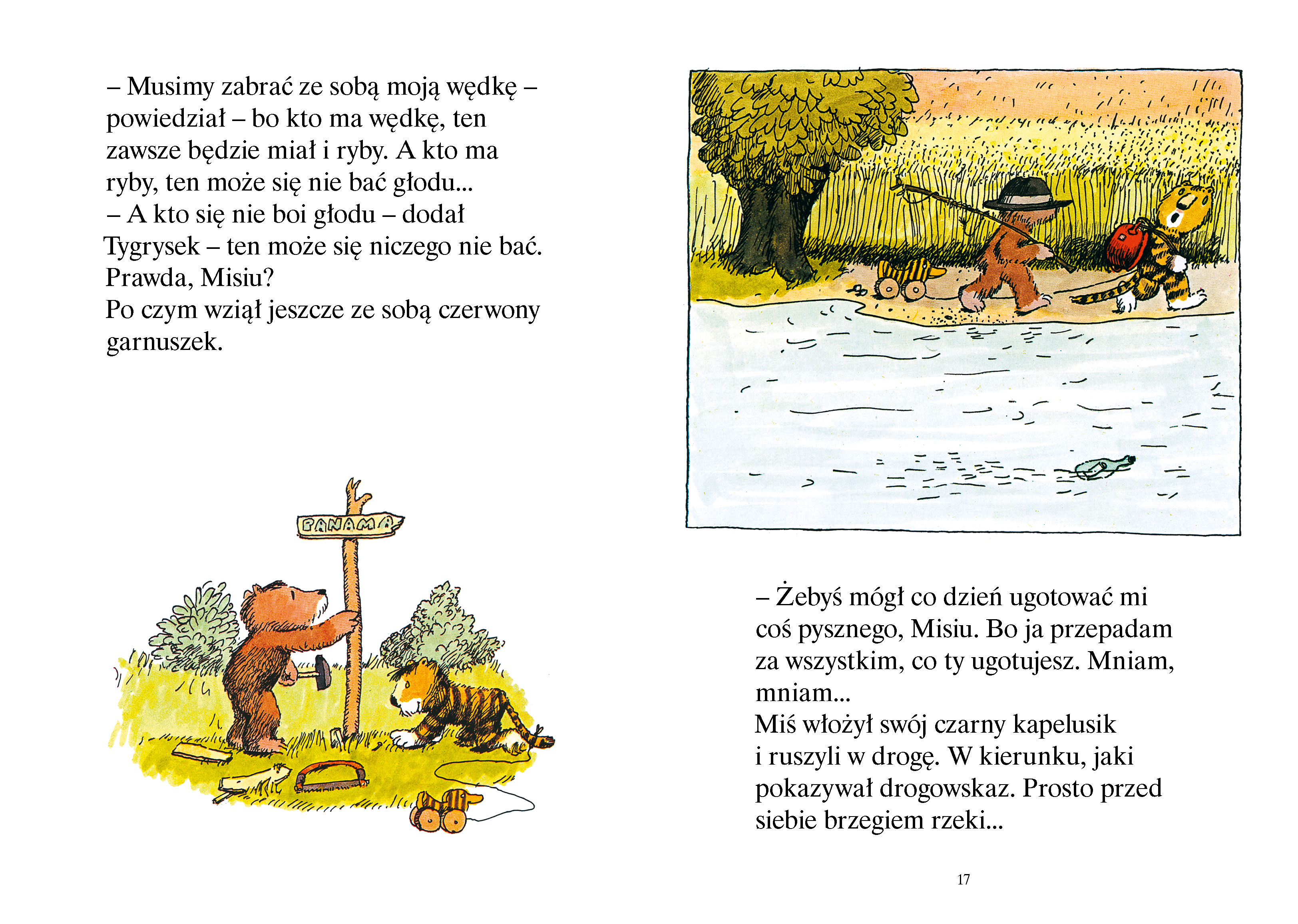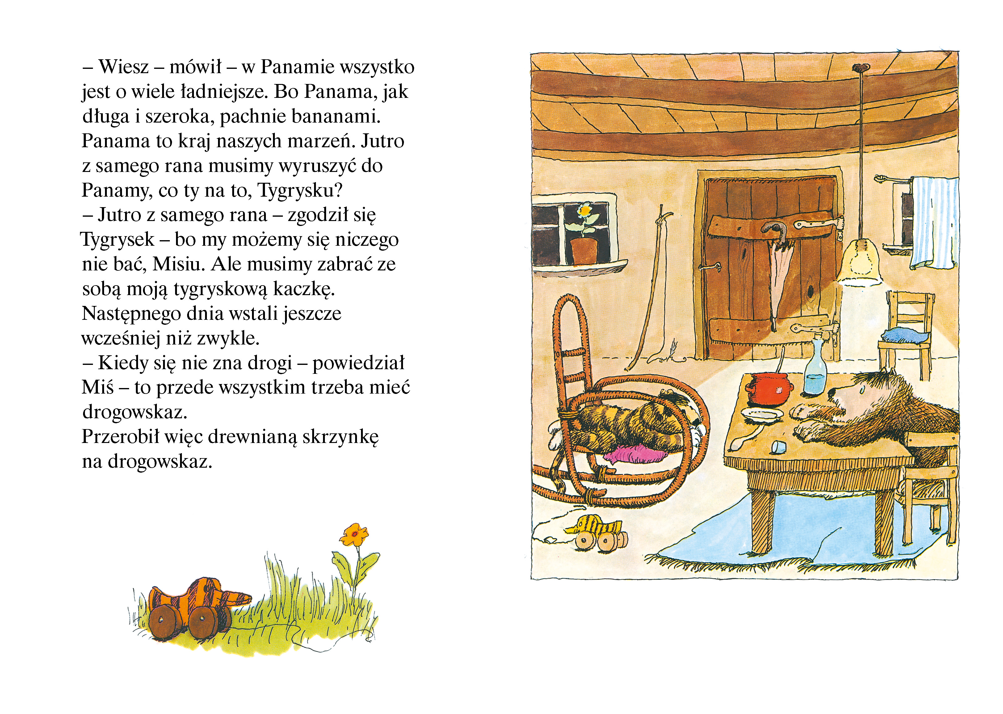 Skrzynka przypłynęła rzeką prosto z pachnącej bananami Panamy. A Panama to kraj marzeń. Kraj marzeń wart jest zaś tego, by go odszukać. Szczególnie, gdy razem jest się silnym jak niedźwiedź i odważnym jak tygrys. Misiowi i Tygryskowi nie przeszkodzą brak drogowskazów, głód, deszcz ani kiepskie rady Wrony. Bo gdy ma się przyjaciela, można się niczego nie bać! Czy warto wędrować tyle dni w poszukiwaniu Panamy? Czego można się dowiedzieć o szczęściu, moknąc w czasie ulewy i głodując, gdy w pobliżu nie ma żadnej rzeki pełnej ryb? Ach, jak cudowna jest ta historia! x