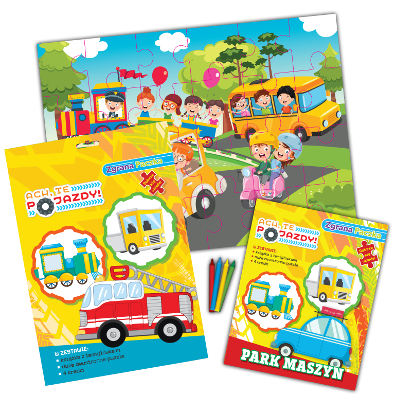 Opis produktuZasady bezpieczeństwaZnajdziemy w zestawie książkę pełną zabaw, łamigłówek i zadań, kolorowe kredki z ulubionymi postaciami oraz dwustronne puzzle. Jeden z elementów układanki można pokolorować według własnego pomysłu. x