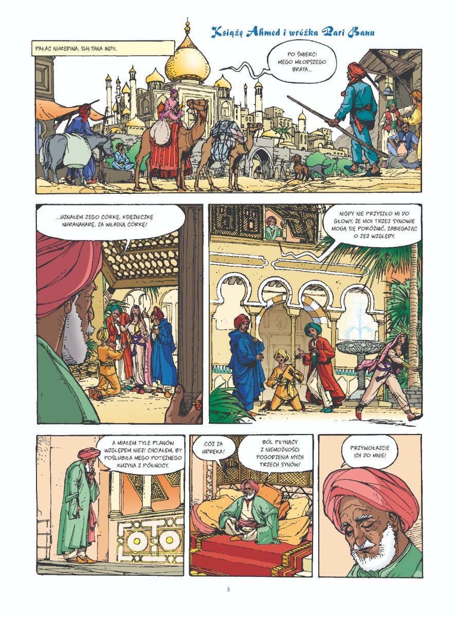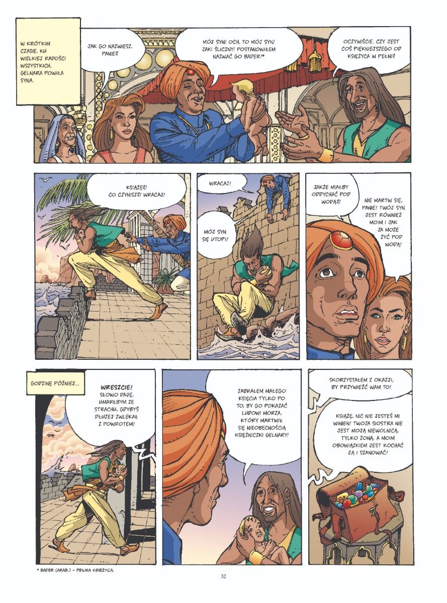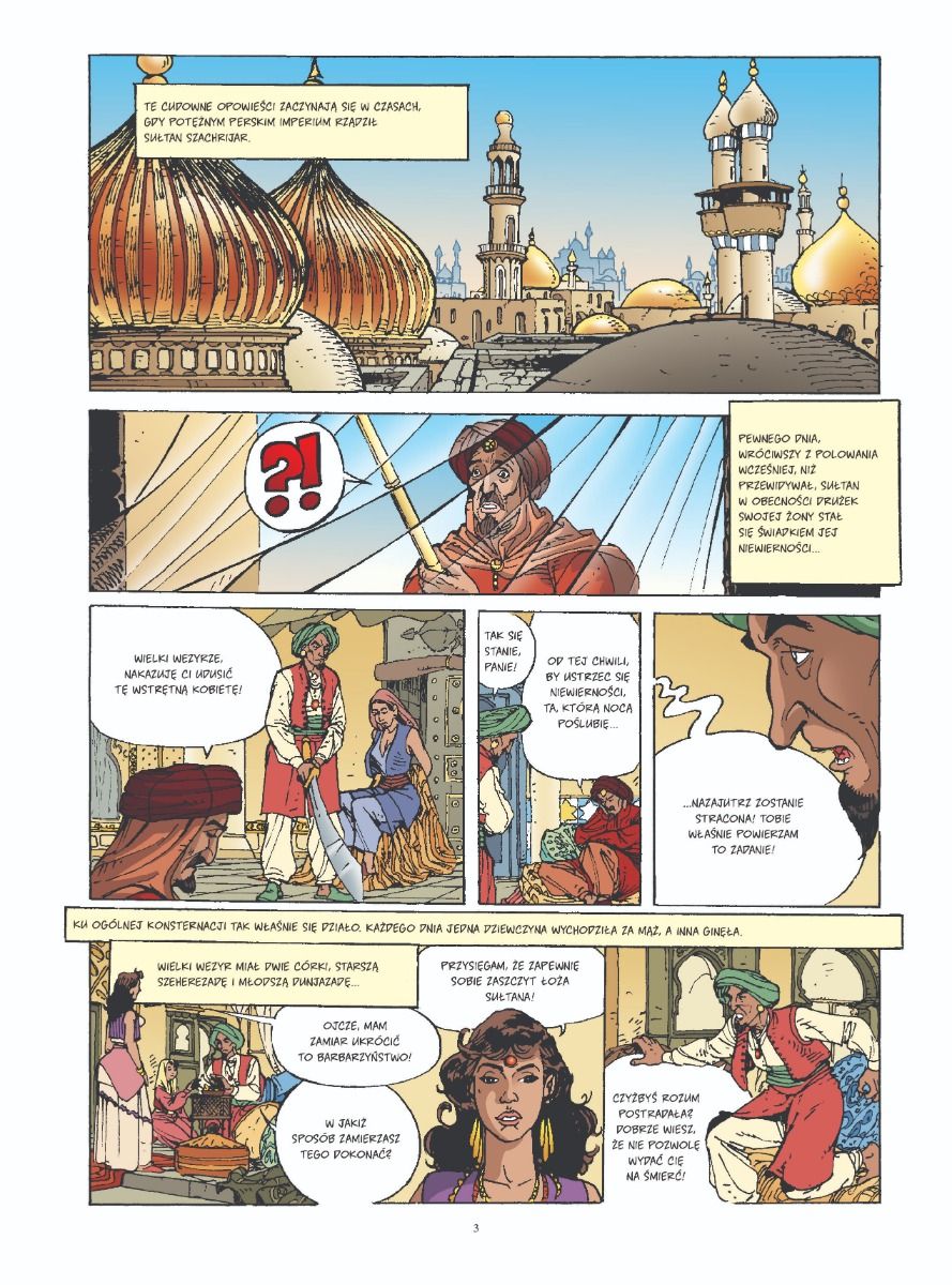 „Baśnie 1001 nocy” (znane także jako „Księga tysiąca i jednej nocy” i „Tysiąc i jedna noc”) są zbiorem opowieści opartych na dawnych baśniach, podaniach i legendach arabskich, perskich, staroindyjskich i babilońsko-asyryjskich. Są to niezależne od siebie utwory spięte w całość przez legendę o sułtanie Szahrijarze i jego żonie Szeherezadzie. Okrutny sułtan, przekonany o niewierności kobiet, każdą ze swoich żon każe zabić natychmiast po nocy poślubnej. Aby uniknąć tego losu Szeherezada rozpoczyna każdej nocy tak pasjonującą opowieść, że sułtan pragnie poznać jej zakończenie i odkłada wykonanie wyroku. Zaliczane do arcydzieł literatury światowej „Baśnie” powstały w IX–X w. Były odbiciem wyobrażeń prostych ludzi na temat życia sfer wyższych, dlatego często zawierają naiwne i pełne przesady opisy ich życia. Autorem komiksowej adaptacji tego dzieła jest francuski scenarzysta Daniel Bardet (zm. w 2022 roku), znany z innych albumów serii Adaptacje literatury („Nędznicy”, „Baśnie 1001 nocy”), zaś rysunki wykonał Rachid Nawa („Journal de Mickey”).