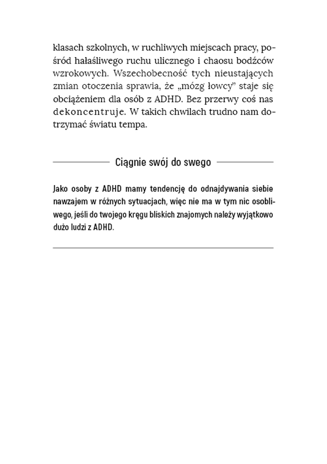 Opis produktuZasady bezpieczeństwaTrudno ci się skupić na jednym zadaniu, robisz sto rzeczy naraz i masz problem z dotrzymaniem deadline'ów? To nie musi być lenistwo ani prokrastynacja. To może być ADHD. Dawniej sądzono, że z tego zaburzenia stopniowo się wyrasta. Najnowsze badania wskazują jednak na to, że może się ono utrzymywać przez całe życie. Dorośli z ADHD uchodzą często za ludzi impulsywnych, leniwych, niecierpliwych, nerwowych, mających trudności z koncentracją i utrzymaniem porządku. Jednak Kristina Leer, lekarka psychiatrii ze zdiagnozowanym ADHD, przekonuje, że zaburzenie to nie musi być wyrokiem - to może być twoja supermoc! Osoby z ADHD mają tak zwany mózg łowcy, cechują się kreatywnością i spontanicznością, a także emanują pozytywną energią, którą potrafią zarażać innych. Mają zdolność do osiągania niezwykłego stanu hiperskupienia i potrafią przyswoić niezwykłą ilość wiedzy w bardzo krótkim czasie. Autorka książki pokazuje ADHD z nowej perspektywy, sięga do współczesnych badań i teorii oraz proponuje techniki i strategie radzenia sobie z tym zaburzeniem w dorosłym życiu, a także omawia zalety posiadania nieneurotypowego mózgu. Poznaj swoją supermoc i żyj lepiej z ADHD! Kristin Leer to doświadczona norweska lekarka psychiatrii, u której w wieku 44 zdiagnozowano ADHD, a także mama dwójki dzieci, w tym jednego z tym samym zaburzeniem. x