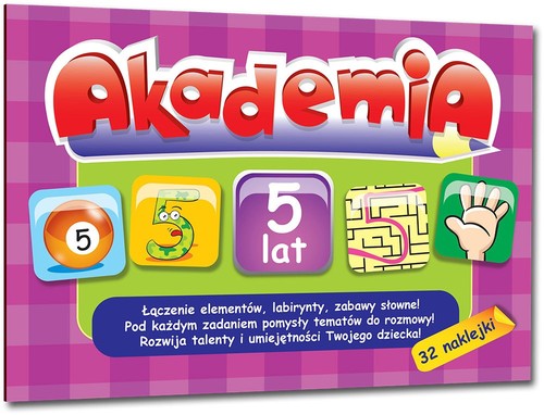 Dzieci w wieku 5 lat są złaknione wiedzy, uwielbiają łamigłówki, zadania logiczne, zadania słowne, zagadki i rebusy. Akademia 5 lat zawiera wszystkie typy interesujących dla dzieci zadań, zilustrowane w zabawny i przyjemny sposób. Co ważne - są one dopasowane do wieku i umiejętności dzieci w tym wieku.Labirynty i łamigłówki są bardziej skomplikowane, ciekawsze, wymagające większego skupienia, dzięki czemu dziecko nie ma możliwości się znudzić ani zniechęcić. Dodatkowym atutem są kolorowe naklejki wielokrotnego użytku oraz interesujące tematy do rozmowy z dzieckiem pod każdym zadaniem.Serdecznie polecamy!