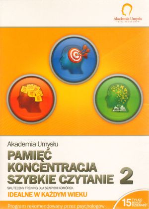 Po sukcesie pierwszej części nowoczesnych programów z serii Akademia Umysłu, prezentujemy kolejną edycję! Programy przeznaczone są dla uczniów, studentów i tych wszystkich, którzy pragną w pełni wykorzystać niezwykłe możliwości własnego mózgu. Rozwijają one bowiem zdolności umysłowe w trzech obszarach: Pamięć, Koncentracja, Szybkie Czytanie. Ćwiczenia są nie tylko skuteczne, ale są też ciekawą i przyjemną formą spędzania czasu! Każdy z programów to: aż 16 ciekawych ćwiczeń i setki opcji - nigdy się nie znudzisz 10 poziomów trudności - dostosujesz trening do swoich potrzeb i umiejętności tryb nauki - program ocenia postępy, dobiera intensywność i trudność ćwiczeń intuicyjny i atrakcyjny interfejs - łatwa i przyjemna obsługa programu nieograniczona liczba użytkowników - cała rodzina może ćwiczyć i zapisywać swoje wynikiPAMIĘĆ: Program zawiera najnowsze metody, techniki i systemy doskonalenia pamięci. Znajdziesz tu ćwiczenia, które zwiększą Twoją zdolność zapamiętywania: tekstów, znaków, liczb, obrazów, sytuacji. Skróci się czas potrzebny na zapamiętanie informacji. Wzrośnie zdolność jej długoterminowego przechowywania. Nabyte umiejętności wykorzystasz, aby zapamiętywać: obce słówka, numery telefonów, terminy spotkań, imiona, nazwiska i twarze, treść czytanych gazet i książek. KONCENTRACJA: Patrząc - widzieć, rejestrować, pamiętać. To cel tego programu. Dzięki treningowi postrzegania, możesz pozbyć się problemów z koncentracją i podzielnością uwagi, zacząć więcej widzieć i zapamiętywać. Świat stanie się bardziej wyrazisty i czytelny. Powiększy się Twoja zdolność logicznego i przestrzennego myślenia i rozwiniesz swoją wyobraźnię. Będziesz więcej widzieć wokół siebie.SZYBKIE CZYTANIE: Ten program nauczy jak sprawniej je czytać i przyswajać. Sprawniej to znaczy szybciej, a jednocześnie z lepszym zrozumieniem oraz łączeniem nowej informacji z całością posiadanej wiedzy. Nauczysz się też czytać wybiórczo, przeszukując tekst celem znalezienia konkretnej informacji. Jest to niezwykle użyteczne np. przy przeglądaniu internetu. Łącząc techniki szybkiego czytania i zapamiętywania wejdziesz na niedostępne dotąd wyżyny wiedzy. Ponadto w tegorocznej - IX. edycji Konkursu: ""Świat przyjazny dziecku"" otrzymały główną nagrodę w kategorii multimedia. Konkurs organizuje Komitet Ochrony Praw Dziecka, a celem Konkursu jest m.in. wyróżnienie i nagrodzenie produktów dla dzieci w wieku 0-14 lat obecnych na polskim rynku, dostosowanych pod względem formy i treści do wieku dziecka, które w znaczący sposób wpływają na rozwój poznawczy, społeczny i emocjonalny oraz na wrażliwość estetyczną dziecka. Obie edycje programów z serii Akademia Umysłu są równorzędne pod względem trudności. Nie jest ważne, od której części zaczniesz!
