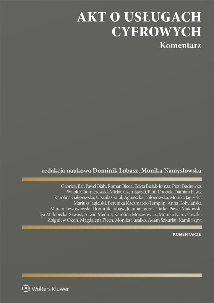 Opis produktuZasady bezpieczeństwaKomentarz zawiera najbardziej kompleksowe na rynku opracowanie i wyjaśnienie regulacji aktu o usługach cyfrowych, ze wskazaniem kierunków wykładni, ułatwiających wdrożenie przepisów przez podmioty zobowiązane, przed wszystkim oferujących usługi pośrednie online, jak i stosowanie zarówno przez komercyjnych użytkowników usług cyfrowych, jak i organy nadzorcze. Opracowanie w sposób szczegółowy omawia nowe regulacje, które mają na celu w szczególności: zwalczanie nielegalnych treści online, w tym odnoszących się do nielegalnych towarów i usług, wzmocnienie pozycji użytkowników i ich przedstawicieli, w tym przez zapewnienie możliwości zgłaszania nielegalnych treści, zakwestionowania decyzji o moderowaniu treści i dochodzenia zadośćuczynienia za pośrednictwem mechanizmu rozstrzygania sporów lub zadośćuczynienia sądowego, wprowadzeniu obowiązków systemowej oceny i mitygowania ryzyka nakładanych na VLOP i VLOSE oraz zabezpieczenia dzieci oraz ograniczenia w wykorzystywaniu wrażliwych danych osobowych do celów reklamy targetowanej; wzmocnienie nadzoru i egzekwowania przepisów wobec wszystkich dostawców usług pośrednich, przy istotnej roli niezależnych koordynatorów ds. usług cyfrowych w każdym państwie członkowskim UE i Europejskiej Rady ds. Usług Cyfrowych, a ponadto wyposażenie Komisji Europejskiej w dodatkowe uprawnienia nadzorcze w odniesieniu do VLOP i VLOSE. Wkład w opracowanie komentarza wniosło prawie 30 autorów o rozległych kompetencjach merytorycznych z zakresu problematyki nowych technologii, usług cyfrowych, ochrony danych osobowych, będących praktykami z Parlamentu Europejskiego, Komisji Europejskiej, Urzędu Ochrony Danych Osobowych, Kancelarii Sejmu, ekspertów Europejskiej Rady Ochrony Danych, organizacji branżowych, jak i doradcami prawnymi z renomowanych kancelarii prawnych oraz z działów prawnych dużych przedsiębiorstw internetowych, przedstawicielami nauki polskiej i międzynarodowej z wiodących uczelni. Komentarz przeznaczony jest dla dostawców usług pośrednich (dostawców dostępu do internetu, usług hostingowych, takie jak przetwarzanie w chmurze, rejestratorów nazw domen, internetowych, platform handlowych, sklepów z aplikacjami, sieci społecznościowych, platform udostępniania treści, internetowych platform podróży i zakwaterowania), a także dostawców bardzo dużych platform internetowych i bardzo dużych wyszukiwarek internetowych. Publikacja będzie przydatna również prawnikom praktykom - radcom prawnym, adwokatom, sędziom, a także pracownikom administracji rządowej i samorządowej. x