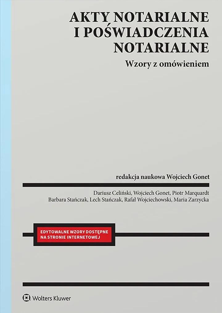 Opis produktuZasady bezpieczeństwaKsiążka zawiera niezbędne wzory aktów notarialnych oraz poświadczeń stosowanych w codziennej praktyce w kancelariach notarialnych. Jej treść została opracowana specjalnie z myślą o notariuszach, zastępcach notarialnych oraz aplikantach notarialnych, aby ułatwić i usprawnić ich pracę. W publikacji czytelnik znajdzie wzory różnych aktów notarialnych, takich jak akty poświadczenia dziedziczenia, europejskiego poświadczenia dziedziczenia, akty powołania zarządcy sukcesyjnego oraz akty odwołania zarządcy sukcesyjnego. Dzięki nim będziesz mógł skutecznie i profesjonalnie obsługiwać sprawy związane z dziedziczeniem i zarządzaniem sukcesyjnym. W przypadku najpopularniejszych umów – jak sprzedaż, darowizna, protokoły zgromadzeń spółek – starano się przedstawić kilka wzorów dotyczących odmiennych przypadków. W książce zamieszczono także rzadko sporządzane wzory aktów notarialnych, jak np. przekształceń przedsiębiorcy indywidualnego, spółki cywilnej czy spółek osobowych w spółki kapitałowe, zgody małżonków na dokonanie czynności prawnych, zebrań wspólnot mieszkaniowych, odstąpienia od umowy sprzedaży oraz umów z udziałem syndyka masy upadłości. Dodatkowo książka zawiera również wzory poświadczeń, które są bardzo ważne w codziennej pracy notariusza. Publikacja została opracowana przez doświadczonych prawników, którzy posiadają ogromną wiedzę i doświadczenie w dziedzinie notariatu. Dzięki temu można mieć pewność, że jej treść jest rzetelna, aktualna i kompleksowa. x