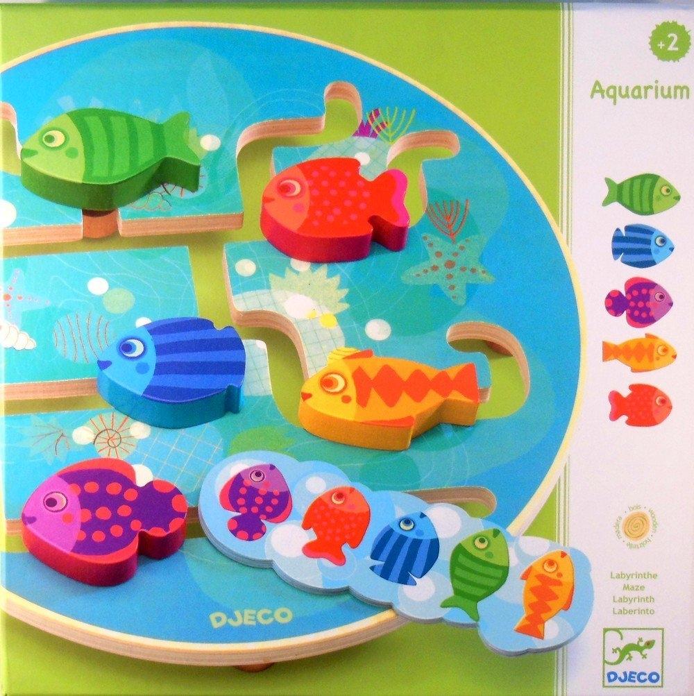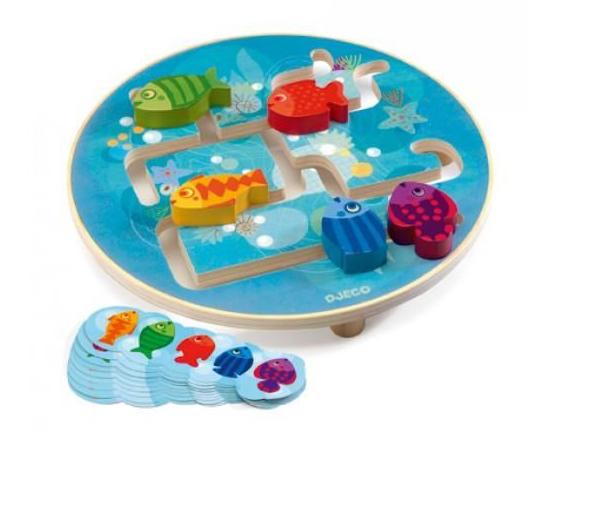 Drewniany labirynt - akwarium, po którym  dziecko porusza kolorowymi rybami w wydrążonych rowkach. Walory edukacyjne: rozwój małej motoryki ręki, koordynacja oko-ręka, koncentracji, precyzji, wyobrażni, odwzorowywania, logicznego myślenia