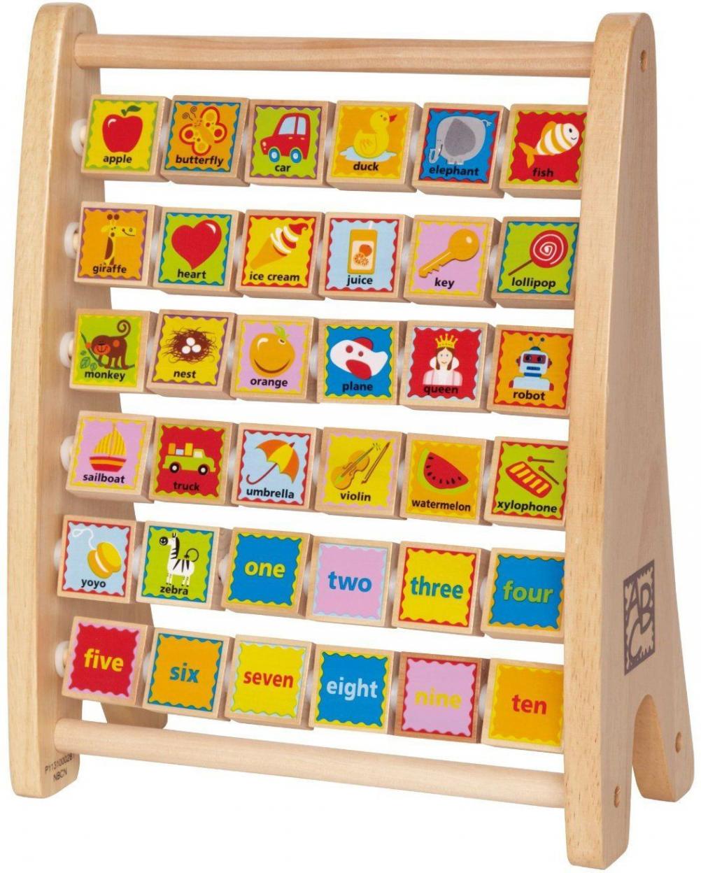Dwustronne liczydło daje możliwość nauki zarówno liter jak i nazw przedmiotów za pomocą kolorowych obrazków.