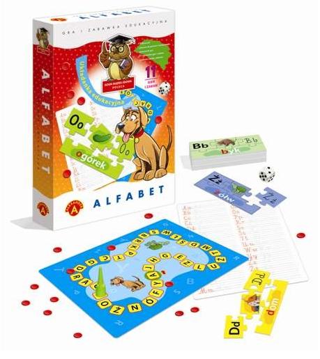 "Alfabet" to świetna zabawa i jednocześnie pomoc dydaktyczna dla dzieci w wieku przedszkolnym. Pudełko zawiera 29 kompletów puzzli (116 szt), ilustrujących kolejne literki alfabetu. Każdy zbiór puzzli składa się z obrazka, elementu z jego nazwą oraz dwóch elementów z pierwszymi literami ( pisaną i drukowaną) tej nazwy. Warianty zabawy, podczas których należy na różny sposób ułożyć puzzle pomagają dzieciom w nauce alfabetu, uczą je rozpoznawania literek, ich kolejności w alfabecie, znajdowania pierwszych literek w wyrazie, ćwiczą pamięć i koncentrację. Dzieci mogą również rozpocząć naukę pisania poznanych literek na specjalnej tablicy, która pokryta jest folią umożliwiającą łatwe ścieranie i ponowne pisanie. Zawartość pudełka: 116 puzzli, plansza do pisania, plansza do gry, pionek, kostka, 40 żetonów, medal, instrukcja.