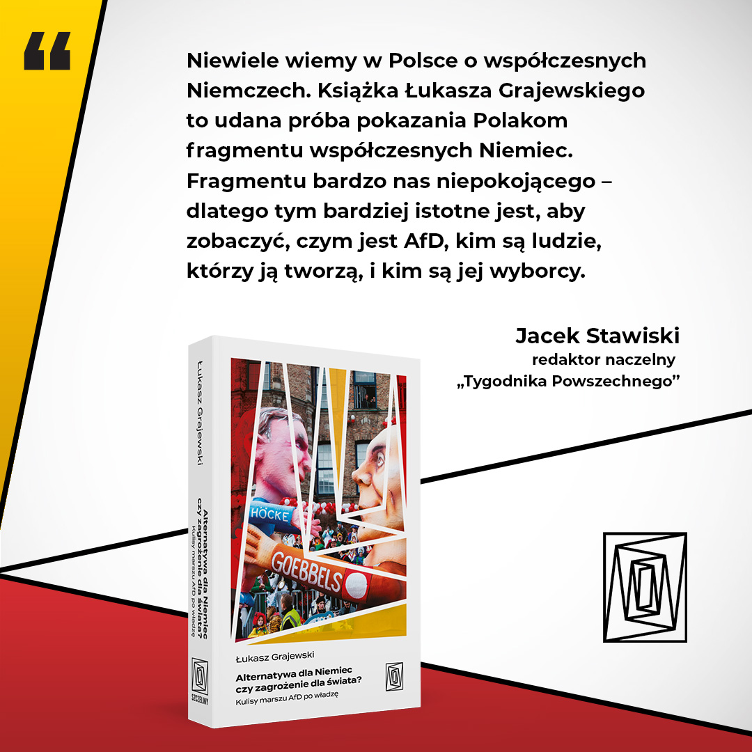 Z wielkim zadowoleniem przyjąłem informację o zbliżającej się premierze książki Łukasza Grajewskiego. Od lat na polskich półkach brakuje aktualizacji sytuacji polityczno-społecznych zza naszej zachodniej granicy, choć tak dużo się tam dzieje. Pod tym względem krajobraz Niemiec jest niezwykle ciekawy z naszej perspektywy. Przez kolejne dziesięciolecia w Polsce walczą ze sobą zwolennicy prawicowego PiS-u i demokratycznej KO. W Niemczech przez wiele lat niemal nie było prawicy reprezentowanej w Bundestagu. Tę lukę wypełniła właśnie AfD…