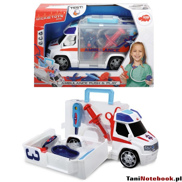 Pojazd z wolnym biegiem, światłem i dźwiękiem, z tyłu otwierana skrzynka z przyrządami lekarskimi: pęsetą,