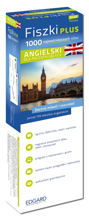 Zawartość: 1000 fiszek + CD-ROM z programem i nagraniami MP3 + Kolorowe przegródki + etui Dlaczego Fiszki Plus? - uczysz się, korzystając z kompleksowego systemu o doskonałej jakości merytorycznej - ćwiczysz wymowę i trenujesz rozumienie ze słuchu tworzysz playlisty nagrań, które odpowiadają Twoim potrzebom - do wykorzystania na komputerze, w telefonie lub odtwarzaczu mp3 - powtarzasz aktywnie z programem poprzez ćwiczenia i gry językowe - poznajesz gotowe wzorce komunikacyjne w przykładowych zdaniach Czy wiesz, ze 1000 słów wystarczy, by czytać ze zrozumieniem 70% tekstów użytkowych w języku obcym? Fiszki Plus to kompleksowy system nauki - poznasz z nim ponad 1000 najważniejszych słów, a także wzory odmian, formy nieregularne oraz poprawna wymowę. Przykładowe zdania do KAŻDEGO słówka to gotowe wzorce komunikacyjne, dzięki którym przećwiczysz ich użycie w kontekście. System Fiszki Plus pozwoli Ci szybko opanować podstawy i umożliwi swobodne porozumiewanie się w języku angielskim. - Ucz się słów i przykładowych zdań - poznaj użycie słów w kontekście. Opanuj synonimy, idiomy; poznaj reguły gramatyczne. - Zapamiętuj skutecznie, wykorzystując system z kolorowymi przegródkami. - Poznaj prawidłowa wymowę. Słuchaj nagrań wszystkich słówek i zdań wraz z tłumaczeniami. - Utrwalaj materiał z ?wiczeniami i grami językowymi zawartymi w programie. - Powtarzaj słówka umieszczone na memoliście i sprawdź, co już umiesz. - Ucz się mobilnie - w drodze do pracy lub szkoły!