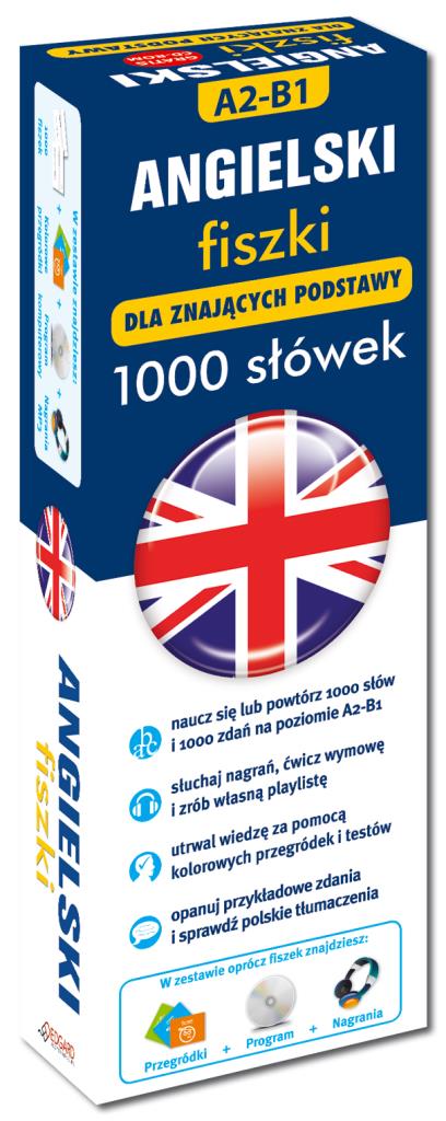 Dzięki nauce z fiszkami:- poznasz 1000 niezbędnych słów, dzięki którym zaczniesz swobodnie rozmawiać po angielsku,- opanujesz 1000 zdań z tłumaczeniami - poznasz i powtórzysz gotowe wzorce komunikacyjne oraz użycie słów,- z programem Aktywny Trening stworzysz własną playlistę, którą przesłuchasz na dowolnym odtwarzaczu,- szybko i skutecznie opanujesz słownictwo z 30 grup tematycznych, - posłuchasz gotowych nagrań MP3 i przećwiczysz wymowę,- sprawdzisz prawidłową pisownię słów dzięki funkcji karaoke,- będziesz ćwiczył język o każdej porze i w dowolnym miejscu,- utrwalisz wiedzę za pomocą kolorowych przegródek i testów.W skład unikalnego zestawu wchodzą: 1000 fiszek, kolorowe przegródki, płyta z gotowymi nagraniami MP3, programem do generowania osobistej playlisty, funkcją karaoke i testami. Nauka z kursem pozwala skutecznie opanować angielskie słownictwo na poziomie A2-B1. Opanowanie materiału umożliwia swobodną komunikację na poziomie podstawowym i średnio zaawansowanym.