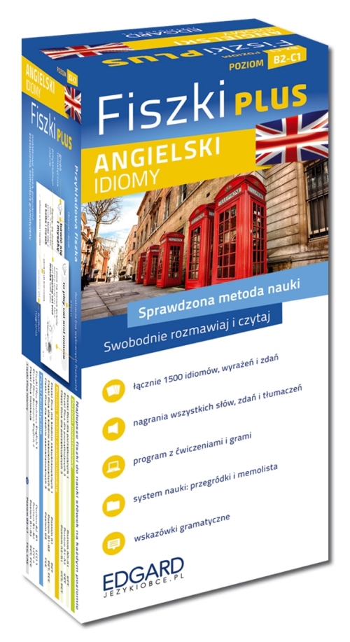 Opis produktuZasady bezpieczeństwaFiszki PLUS Idiomy (B2-C1) to pakiet 600 fiszek będący częścią rozbudowanego systemu nauki, dzięki któremu szybko i skutecznie nauczysz się ważnych idiomów, niezbędnych do swobodnego porozumiewania się po angielsku. Każdy zestaw Fiszek PLUS to starannie przygotowany materiał, wysokiej jakości nagrania wymowy wraz z programem komputerowym, memolistą i grami językowymi. Z Fiszkami PLUS nie tylko zapamiętujesz słówka, lecz także poznajesz słownictwo w kontekście, uczysz się nieregularnych form oraz popularnych zwrotów językowych. Od dziś nauka języka stanie się przyjemnością! - Ucz się ponad 1500 idiomów, wyrażeń i zdań – poznaj użycie gotowych wzorców komunikacyjnych, utrwal reguły gramatyczne. - Poznaj prawidłową wymowę. Słuchaj nagrań wszystkich słówek i zdań oraz ich tłumaczeń. - Utrwalaj materiał z ćwiczeniami i grami językowymi dostępnymi w programie (do pobrania). - Ucz się skutecznie dzięki systemowi kolorowych przegródek. Sprawdź na memoliście, które słówka już znasz! - Twórz własne playlisty nagrań wymowy i ucz się mobilnie – w drodze do pracy lub szkoły! - Przygotuj się do sprawdzianów i egzaminów językowych (FCE, CAE) Przykładowe idiomy: in the long run country mile Sunday driver road hog silver fox down to earth to no avail sore point puppy love Fiszki PLUS to rozbudowana seria fiszek, ułożona w wygodny system, dzięki któremu sam decydujesz, od którego poziomu zacząć naukę. W ramach serii dostępne są wszystkie trzy poziomy zaawansowania – początkujący, średnio zaawansowany i zaawansowany – oraz fiszki tematyczne Kolokacje, Zwroty konwersacyjne i Business English dla znających podstawy i średnio zaawansowanych. x
