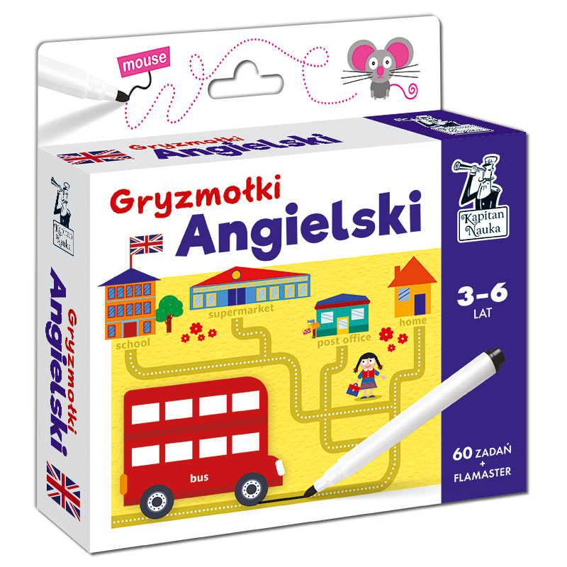 Opis produktuZasady bezpieczeństwaGryzmołki. Angielski (3-6 lat) to zestaw 60 kreatywnych, bogato ilustrowanych zabaw dla przedszkolaków, dzięki którym bez wysiłku przyswoją angielskie słówka. Różnorodne zadania angażujące wyobraźnię, pamięć oraz spostrzegawczość przełożą się na dziecięce zainteresowanie językiem angielskim oraz praktyczną znajomość podstawowego słownictwa. Nauka angielskiego dla przedszkolaków Purple or green? Left or right? Seven bees or ten butterflies? ?Gryzmołki. Angielski? (3-6 lat) to idealny zestaw dla przedszkolaków, które rozpoczynają przygodę z językiem angielskim. Kolorowe ilustracje i urozmaicone zadania zachęcają do liczenia, rozwiązywania krzyżówek i zagadek, wykreślanek, łączenia w pary obrazków z podpisami oraz układania historyjek obrazkowych we właściwej kolejności. Dzięki różnorodnym zabawom dzieci poznają kolory, liczby, nazwy zwierząt, sklepów, owoców i warzyw, a także zabawki. W zestawie znajduje się 60 zadań na kartach zmywalnych oraz flamaster suchościeralny, dzięki czemu ćwiczenia można rozwiązywać wielokrotnie. Rozwój: nauka angielskiego, pamięć, koncentracja, grafomotoryka W serii również: