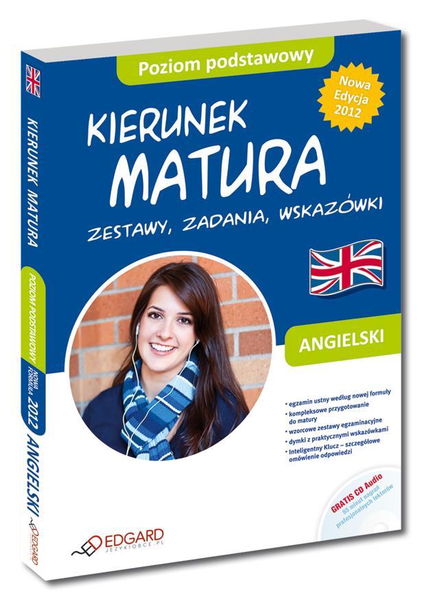 KIERUNEK MATURA Zestawy, zadania, wskazówki obejmuje książkę zawierającą wszystkie rodzaje zadań, jakie można spotkać na maturze, zestawy egzaminacyjne oraz płytę z nagraniami. Przygotowuje do egzaminu pisemnego z języka angielskiego na poziomie podstawowym oraz do nowej formuły egzaminu ustnego obowiązującej od 2012 roku- uzupełnia, weryfikuje i utrwala zarówno wiadomości, jak i umiejętności nabyte podczas nauki w szkole czy na kursach językowych. Polecany jest przede wszystkim osobom, które chcą sprawdzić i doskonalić swoje umiejętności przed przystąpieniem do egzaminu.