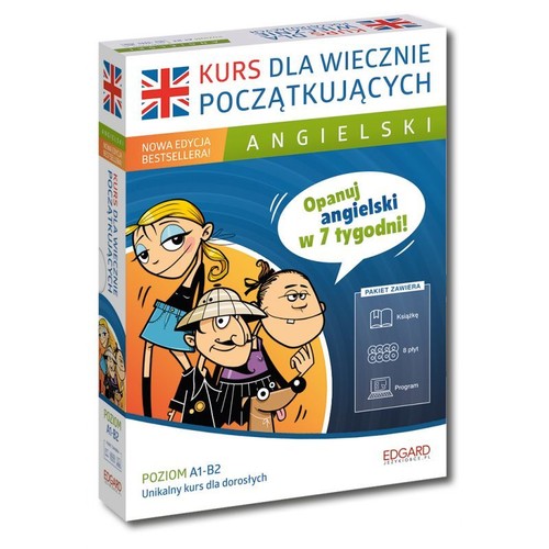 W skład Kursu wchodzą:* - Drukowany podręcznik (208 stron) - Zestaw siedmiu płyt - Program komputerowy * Kurs* umożliwia naukę w sposób zintegrowany lub przy wykorzystaniu wybranych pomocy - w zależności od sytuacji: na komputerze, w domu, w samochodzie, w drodze do pracy. * Każdy z nośników (program, płyty, podręcznik)* podzielony jest na siedem części - tygodni. W trakcie nauki poznasz nie tylko nowe słownictwo, lecz także poszerzysz znajomość języka, powtórzysz gramatykę i, przede wszystkim, nabierzesz pewności w posługiwaniu się językiem angielskim. * Siedem części *dokładnie omawia tematy związane m. in. z: cechami charakteru, nawiązywaniem kontaktów, poszukiwaniem pracy, zakupami, jedzeniem, czasem wolnym, podróżowaniem czy nagłymi zdarzeniami. W ostatnim rozdziale znajdują się oryginalne teksty i konwersacje dotyczące kultury brytyjskiej oraz aktualnych problemów społecznych. * Podręcznik* Drukowany podręcznik zawiera: pełen zapis wszystkich nagrań, tłumaczenia, słowniczki i ćwiczenia z odpowiedziami. W kolejnych, dowcipnie zilustrowanych rozdziałach klarownie wyjaśniono najważniejsze zagadnienia gramatyczne, m.in. zasady tworzenia zdań, pytań i przeczeń, czasy przeszłe, teraźniejsze i przyszłe. * Siedem płyt CD* Zamieszczone na siedmiu płytach nagrania (6 godzin) w wykonaniu native speakerów są wzorcem komunikowania się, uczą prawidłowej wymowy i umożliwiają osłuchanie się ze współczesnym językiem angielskim. * Program komputerowy* Opracowany specjalnie na potrzeby kursu program komputerowy uczy słownictwa i gramatyki oraz kształci umiejętność rozumienia ze słuchu. Zawiera nagrania w wykonaniu native speakerów i gry językowe. Program umożliwia naukę i powtórkę przy pomocy aż 10 rodzajów ćwiczeń, m. in. dyktando, tłumaczenie, uzupełnianie zdań i tabel oraz różnych testów. * Kurs* polecamy każdej osobie, która chce szybko odświeżyć znajomość języka, oraz wszystkim pragnącym poszerzyć zasób słownictwa tak, aby lepiej mówić i więcej rozumieć. Angielski Kurs dla wiecznie początkujących jest nową edycją kursu English for You. x