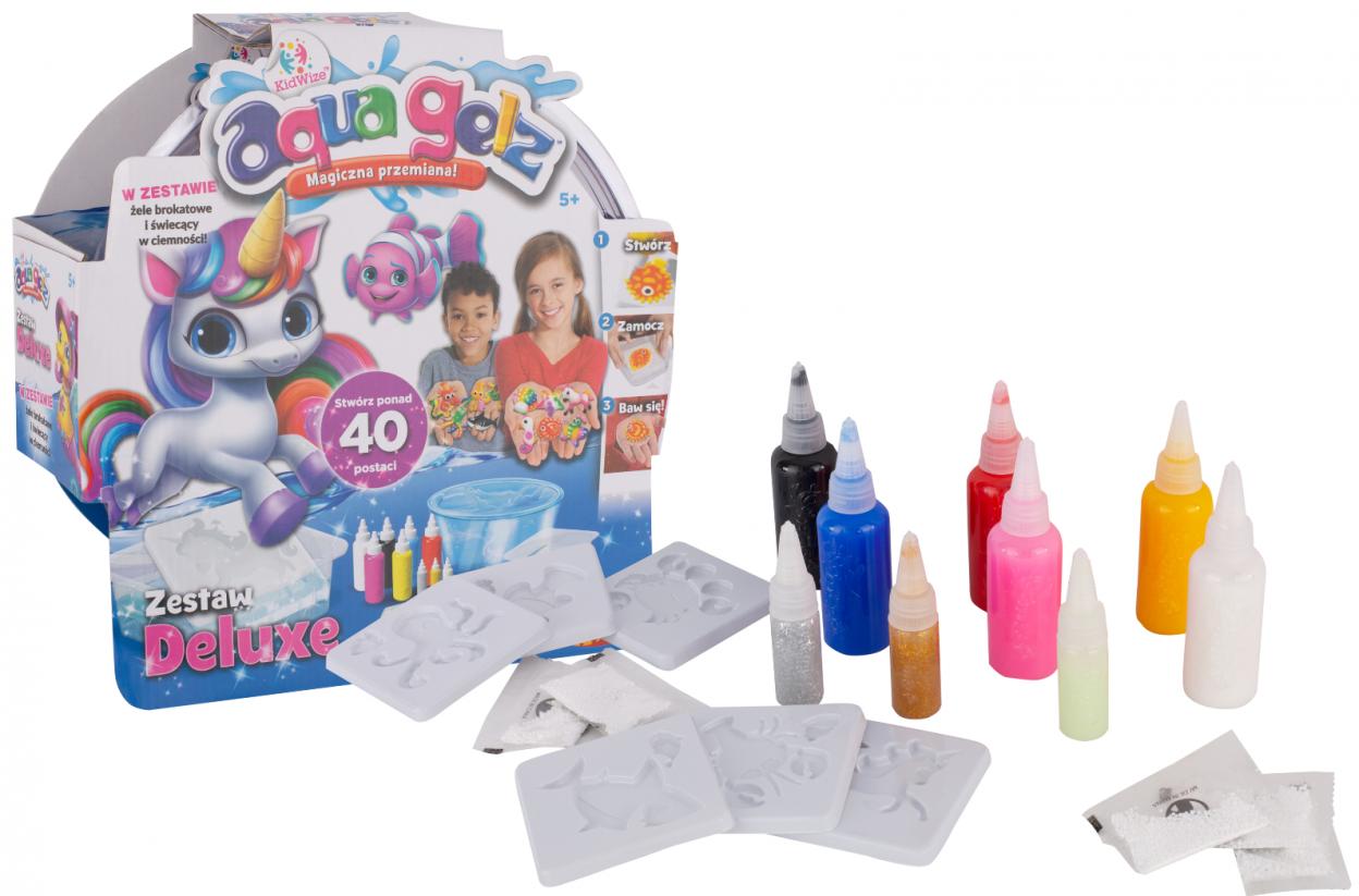 Twórz stworki przy pomocy kolorowego żelu i magicznego roztworu! Wymieszaj w pojemniku magiczny proszek Aqua Gelz z wodą, następnie wybierz szablon i wypełnij go jednym z kolorów. Udekoruj figurę innymi kolorami, aby nadać jej oczy, nos lub inne ładne dekoracje. Zanurz szablon wypełniony żelem w wodzie. Poruszaj nim delikatnie w lewo iw prawo, aby Twoja żelowa figurka wyczepiła się z szablonu, zostaw swój produkt w wodzie, aby był gotowy do zabawy!