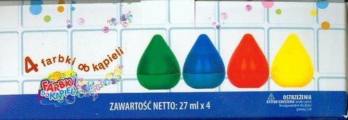 4 pojemniki z farbami (z dozownikiem) do zabawy w kąpieli. Kolory farb: żółta, czerwona, niebieska, zielona.