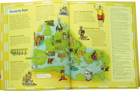 Ten bogato ilustrowany atlas historyczny zaprasza młodsze i starsze dzieci do pasjonującej podróży w czasie i przestrzeni. Przejrzyste, czytelne mapy przedstawiają różne epoki historyczne, przekazują wiedzę o starożytnych cywilizacjach oraz życiu w dawnych czasach. Pouczające, opatrzone ilustracjami teksty dostarczają wiadomości o słynnych postaciach, rewolucjach, które zmieniły świat, wielkich odkryciach i wynalazkach. Quiz edukacyjny, który towarzyszy czytelnikom przez całą książkę, służy zabawie i zarazem pozwala utrwalić świeżo zdobytą wiedzę historyczną i kartograficzną.