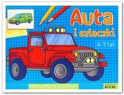 Książeczka zawiera auta do kolorowania i szlaczki do powtarzania oraz zestaw naklejek z autami.