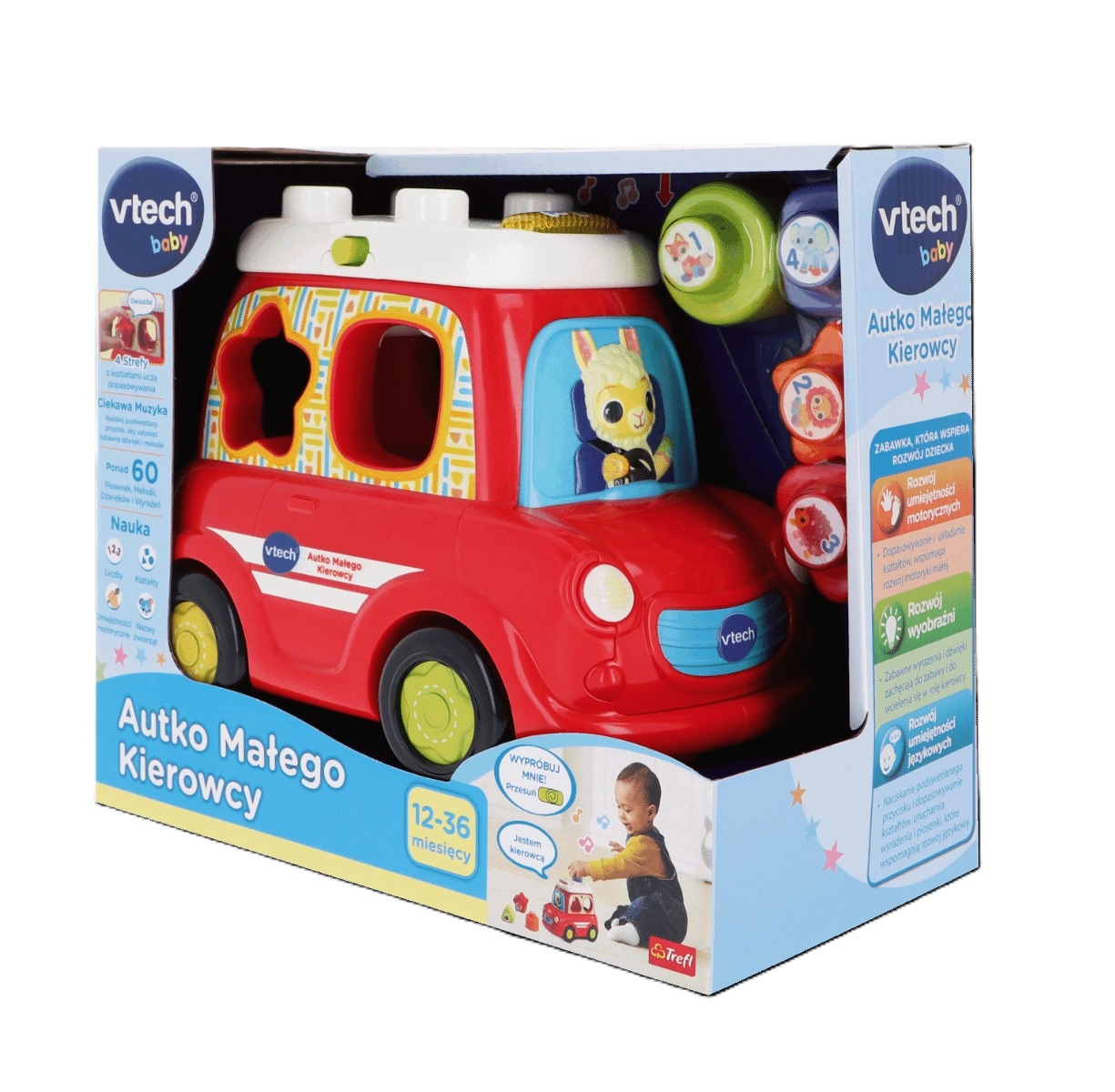 Wyrusz na przejażdżkę z załogą Autka Małego Kierowcy od VTech! Umieszczaj 4 kolorowe klocki o różnych kształtach w odpowiednich otworach w autku. Poznawaj kształty, zwierzęta oraz słuchaj dźwięków, które wydają. Zabawie towarzyszy radosny kierowca - Lama.