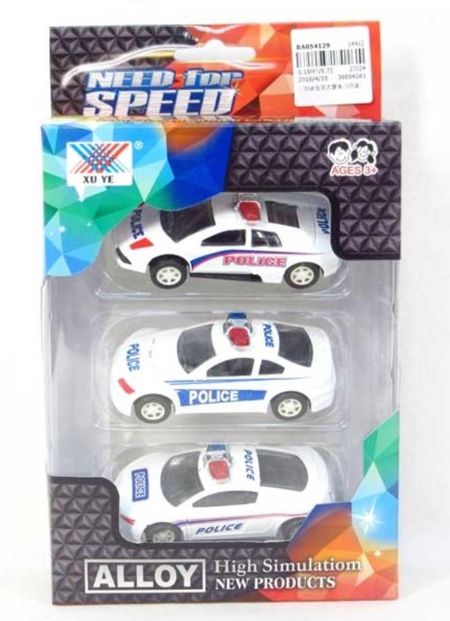 Zestaw trzech kolorowych metalowych samochodzików w skali 1:50