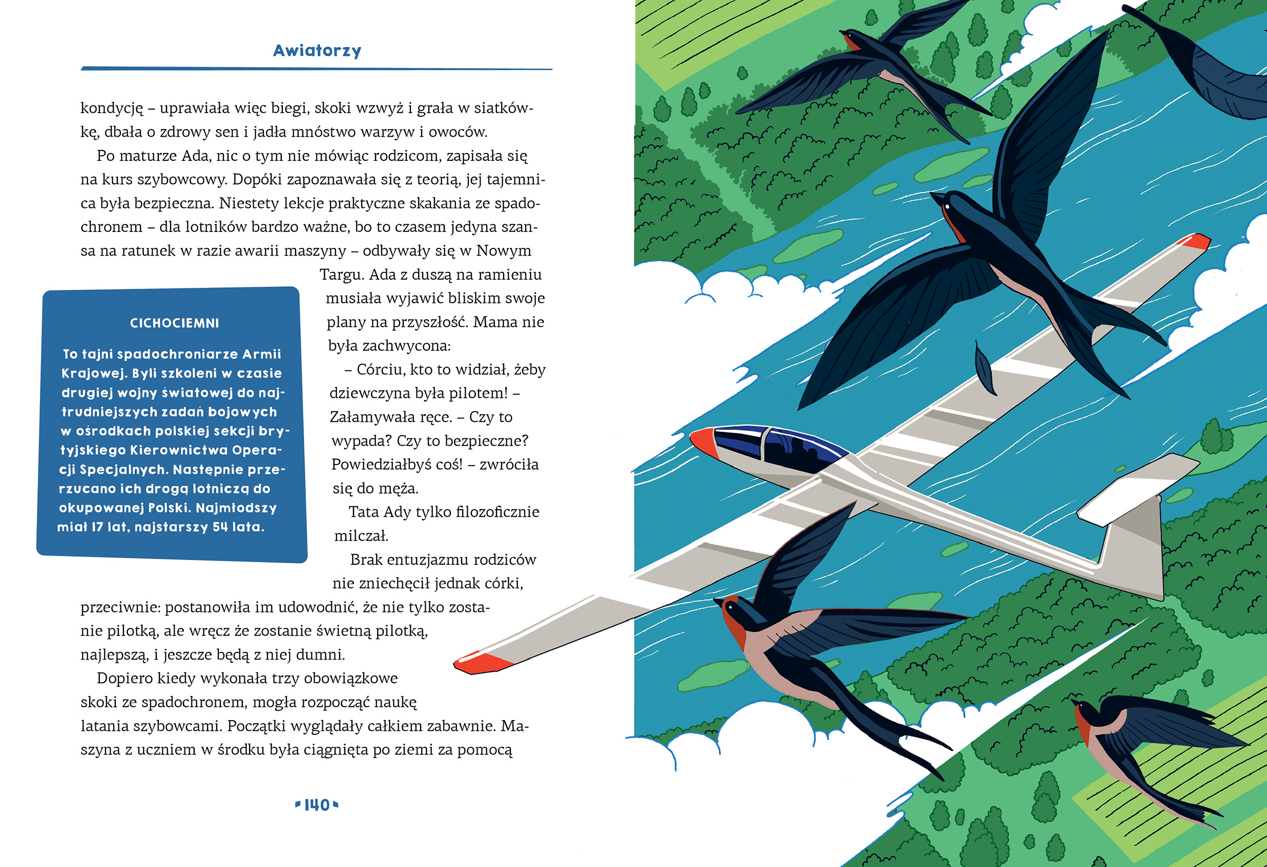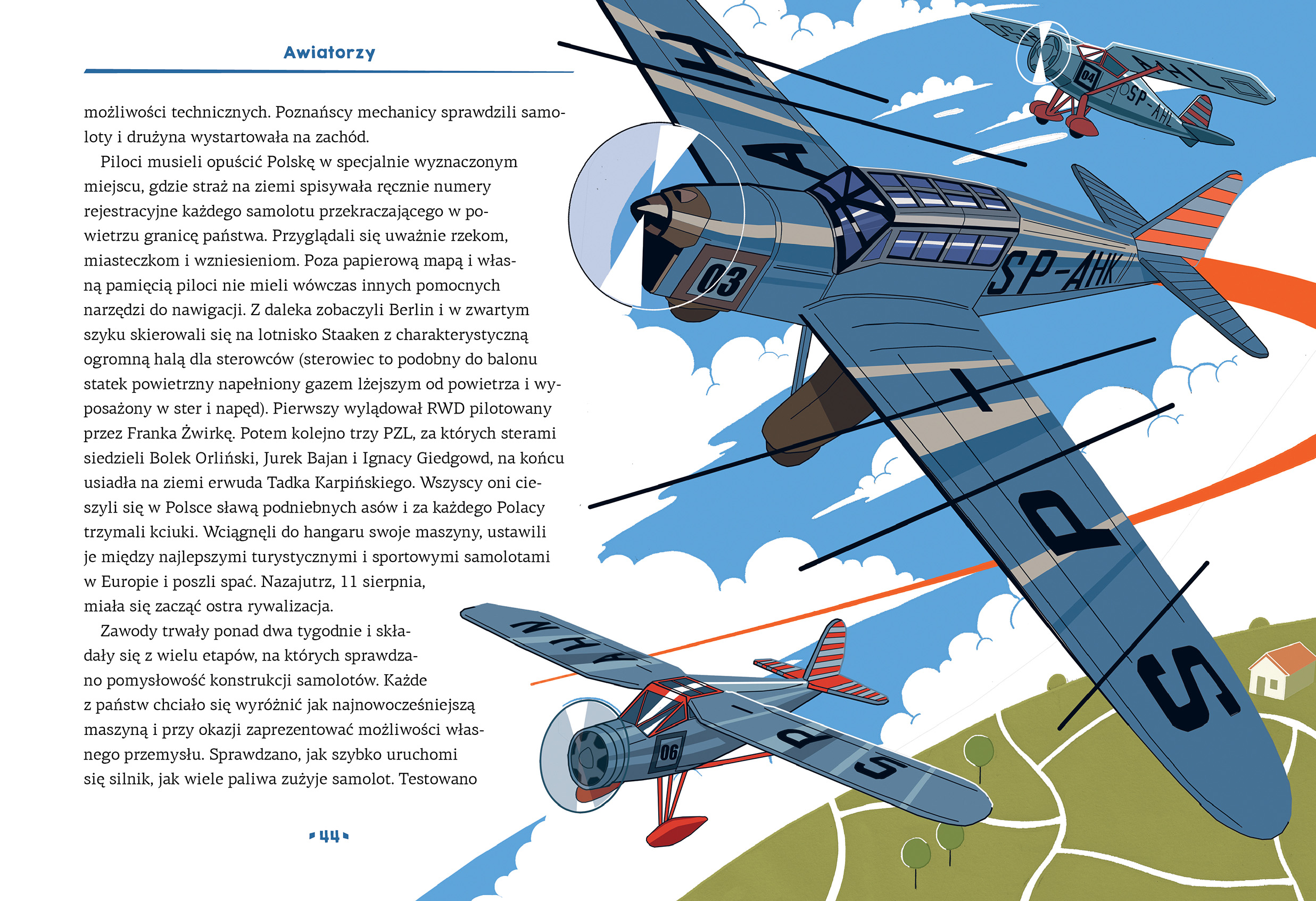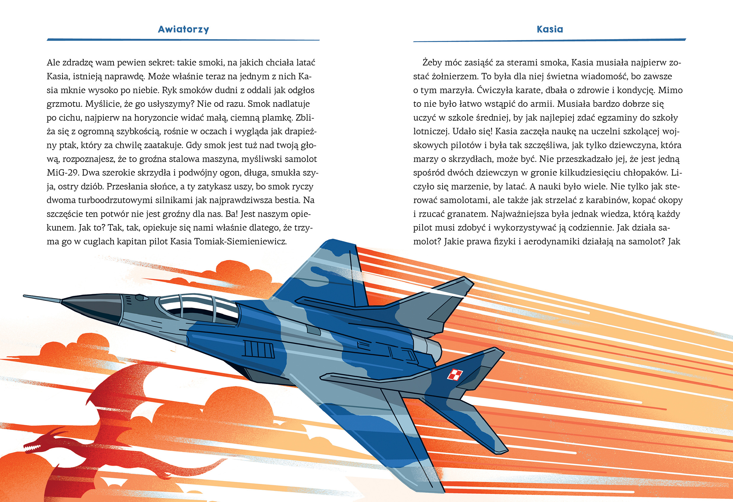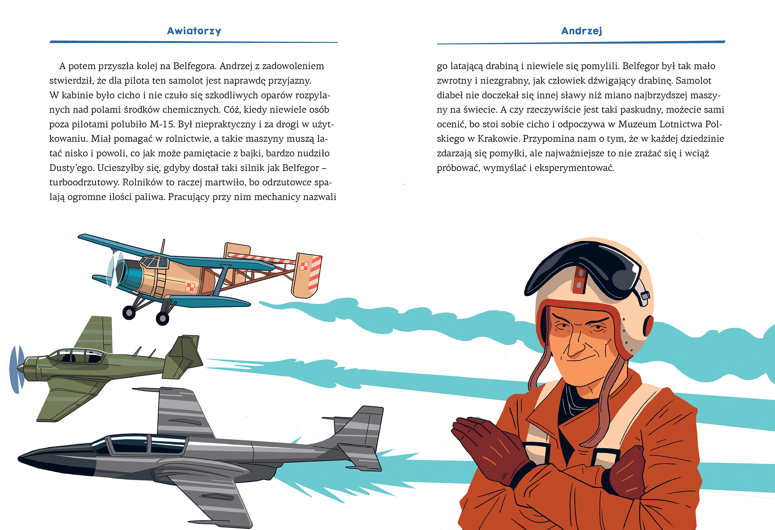 Opis produktuZasady bezpieczeństwaOd dzieciństwa marzyli o podniebnych przygodach, o tym, by siąść za sterami samolotu, wzbić się w powietrze i królować w przestworzach. Poznaj niesamowite historie polskich lotniczek i lotników, poskramiaczy metalowych smoków, pilo-tów oblatywaczy, szybowników, a nawet kosmonautów. Jak długo musiał czekać na poprawę pogody Sebastian Kawa, żeby jako pierwszy (i póki co jedyny) człowiek na świecie przelecieć szybowcem nad Himalajami? Jak wyglądała czekolada, którą Mirek Hermaszewski, jedyny polski kosmonauta, jadł na stacji kosmicznej orbitującej wokół Ziemi? W jakim niecodziennym stroju Stanisław Skarżyński przeleciał samotnie Atlantyk małym turystycznym samolotem (do dziś nikt mniejszym nie pokonał oceanu)? Ile kilometrów musieli przebyć – i ile drużyn pokonać – Żwirko i Wigura w najbardziej wyczerpują-cym rajdzie samolotowym dookoła Europy? Jaki fortel zastosowała Ada Dankowska, najsłynniejsza polska szybowniczka, podczas swojego brawurowego lotu po rekord świata? Marzenia są w zasięgu ręki, a właściwie w zasięgu… skrzydeł! Latać, ale czym? Za każdym lotnikiem stoi – leci! – jego ulubiona maszyna. Samoloty i szybowce mają swoje imiona, często nadawane na cześć konstruktorów, i specjalne podniebne moce, a co najważniejsze: dają się prowadzić tylko wybranym, po prostu najlepszym. Jak okiełznać metalowego smoka MiG-29? Kiedy docisnąć RWD-6, czyli erwudę, żeby przyspieszyć na ostatnich metrach rajdu i wygrać? Jak wprowadzić szybowiec w podniebny taniec… z bocianami i jaskółkami? Dlaczego jedyny na świecie odrzutowy samolot rolniczy dostał imię demona Belfegora? Kolorowe ilustracje, na których wiernie zostały pokazane samoloty, szybowce z różnych czasów, a nawet rakiety kosmiczne, będą nie lada gratką dla przyszłych konstruktorów. A co o swoich przygodach mówią sami bohaterowie? „W lotnictwie kocham to uczucie oderwania od przyziemnego bałaganu. Z góry wszystko wygląda jak piękny malunek. Na dole jest szaro, deszczowo, a ja odrywam się i wychodzę ponad chmury, w słońce i błękit nieba”. Paulina Różyło-Nowicka, pilot oblatywacz „Szybownictwo to piękny sport, dla wnuków i dla dziadków. Można zacząć naprawdę wcześnie i latać bardzo długo, całe życie. To moja pasja, podobnie jak zdobywanie rekordów i wyznaczanie sobie celów. A także radość z sukcesu. Ta radość może być udziałem każdego małego marzyciela”. Ada Dankowska, 15-krotna rekordzistka świata w szybownictwie „Wierzę w to, co robię, i jestem dumna, że mogę nosić mundur. Latanie wojskowymi odrzutowcami to spełnienie moich marzeń. Nie bójcie się marzyć, bo nie ma rzeczy niemożliwych”. kpt. pil. Katarzyna Tomiak-Siemieniewicz, pilot odrzutowca MiG-29, pierwsza Polka, która przekroczyła w locie prędkość dźwięku x