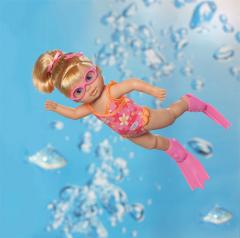 My Little Baby Born uwielbia wodę i jest doskonałą pływaczką - mistrzynią crawla. Gdy zanurzysz małą Baby Born w wodzie, wówczas lalka zacznie automatycznie poruszać rączkami i nogami, dzięki czemu z łatwością utrzymuje się na powierzchni wody i naprawdę pływa. Laleczka ubrana jest w uroczy różowy kostium w kwiatki. W zestawie razem z lalką znajdują się płetwy, okulary do pływania a także grzebień i 2 spineczki.Zabawka wymaga baterii 3 x LR03 (AAA). Baterie nie są dołączone.Wysokość lalki: 32 cmWiek: od 3 lat