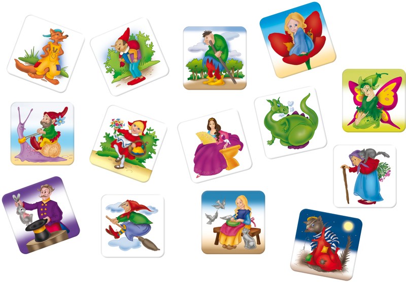 Zestaw zawiera 80 kartoników pogrupowanych w pary. Na obrazkach znajduje się 40 bajkowych postaci, wśród nich: Smok Wawelski, Kot w butach, Syrenka, Calineczka i wielu innych niezwykłych bohaterów.