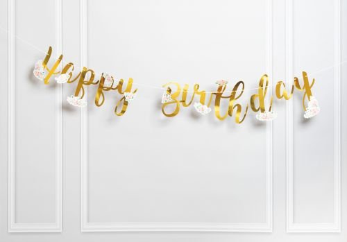 Baner urodzinowy, w złotym kolorze z kwiatowymi elementami.