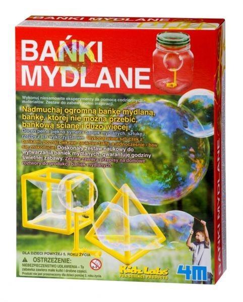 Taca, plastikowe kółko, kolorowa włóczka, piramidalna ramka, sześcienna ramka, roztwór do robienia baniek, 2 uchwyty do sznurka, ustnik, dwie formy do robienia baniek, 2 pałeczki do wykonania olbrzymiej bańki, 2 długie słomki, instrukcja.