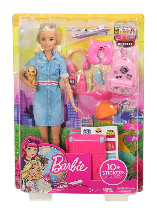 W zestawie znajduje się lalka Barbie® w modnym stroju i butach, szczeniaczek, walizka, plecak, naklejki oraz 10 akcesoriów podróżnych. Lalka nie stoi samodzielnie.