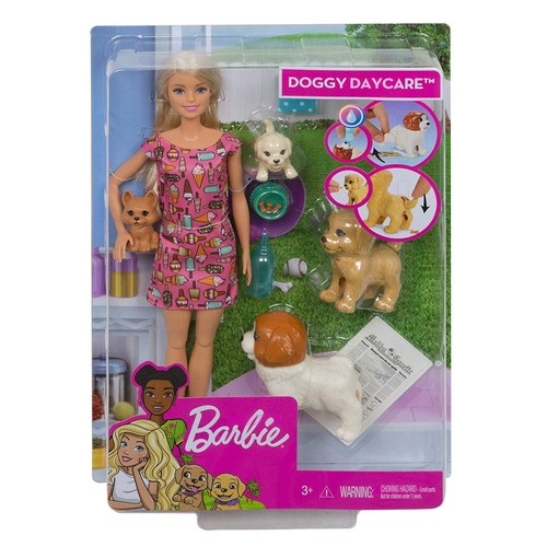 Dwa większe psy z pewnością zachowają swój ruch: jeden z nich może siusiać, a drugi robić kupkę! Miłośnicy małych zwierząt będą się dobrze bawić bawiąc się z lalką Barbie i zestawem do zabawy Doggy Daycare. Opieka nad tymi uroczymi zwierzętami jest tak łatwa. Nakarm dużego jasnobrązowego psa trzema małymi kośćmi, a następnie pchnij go w dół, aby przejść do nocnika! Albo napełnij butelkę wodą i daj dużemu białemu pieskowi (ze słodkimi brązowymi uszami), a następnie umieść go na gazecie i unieś tylną nogę; pies ""siusia"", a woda aktywuje zmianę koloru na gazecie, by uzyskać całkowicie rzeczywisty efekt bez prawdziwego bałaganu! Dwa szczenięta dopełniają stado zwierząt. Koc i miseczka uzupełniają pakiet pielęgnacyjny. Dzieci mogą bawić się przez cały dzień lalką Barbie i jej czterema uroczymi przyjaciółmi. Barbie nosi śliczną sukienkę w lody i białe buty i ma kolana, które się wyginają, aby mogła zaopiekować się psimi przyjaciółmi! Zbierz inne lalki i zabawki Barbie, aby jeszcze bardziej zachęcić wyobraźnię, ponieważ gdy dziewczyna bawi się z Barbie, wyobraża sobie wszystko, czym się może stać! Zestaw zawiera: * lalkę Barbie, ubraną w modne ubranko i buty, * szczeniaka robiącego kupę, * szczeniaka siusiającego, * dwa mniejsze szczenięta, * butelkę z wodą, * naczynie do jedzenia, * trzy kości, * jeden koc * jedną ""gazetę"" zmieniającą kolor. Lalka nie może stać sama. Kolory i dekoracje mogą się różnić. x