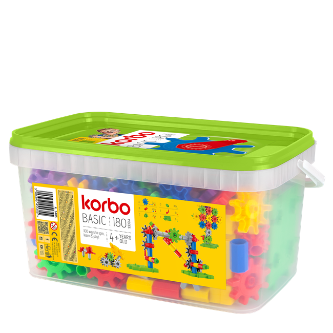Korbo Basic 180 to największy z zestawów Basic. W skład zestawu wchodzą aż 72 koła zębate oraz 8 podstaw. Różnorodność i uniwersalność klocków w tym zestawie pozwala na tworzenie dowolnych konstrukcji. W dołączonej instrukcji znajdziemy 15 pomysłów na zbudowanie różnych konstrukcji o różnych stopniach trudności, na przykład żyrafę, kaczkę czy stonogę albo robota, latarnię wodną czy gazociąg. Zestaw Korbo Basic 180 posiada osiem plansz w dwóch kolorach do tworzenia ciekawych konstrukcji na platformach, więcej elementów dających większe możliwości tworzenia i budowania, piękną kolorystykę pobudzającą dziecięcą wyobraźnię oraz daje możliwość poznawania fizyki i mechaniki przez świetną zabawę.