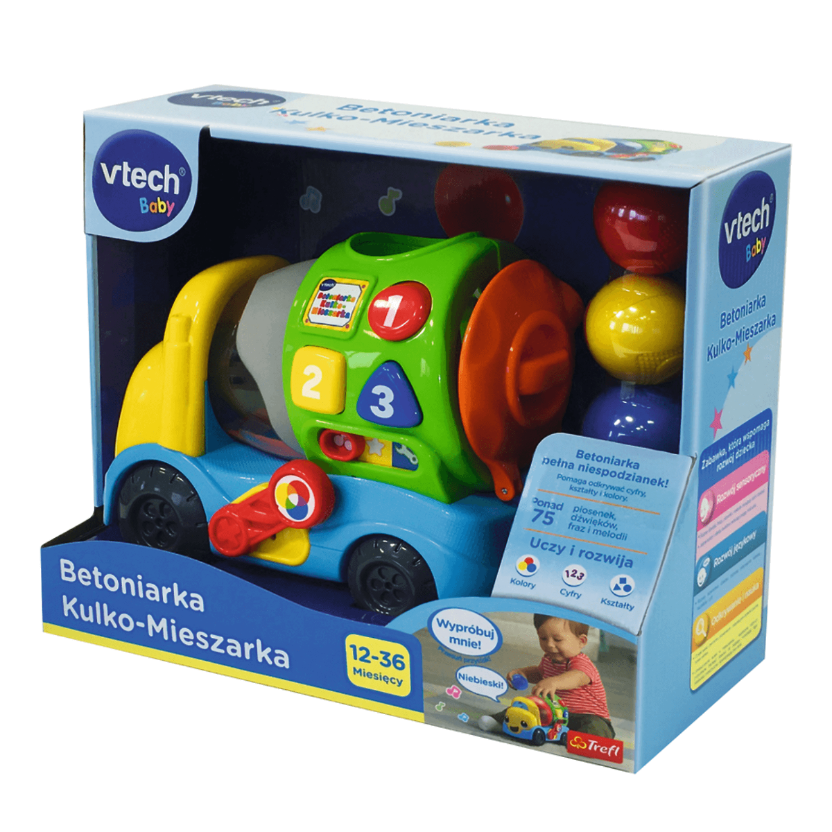 Betoniarka Kulko-Mieszarka, to interaktywna zabawkowa ciężarówka, która z pewnością przysłuży się do rozwoju malucha. Dzięki zabawie Betoniarką Kulko-Mieszarką, Twoje dziecko może dokonać wielu odkryć! Naciskając przyciski lub wrzucając kuleczki do mieszalnika, dziecko uczy się kolorów, cyfr i kształtów. Po naciśnięciu dźwigni mieszalnika, kolory znajdujące się w skrzyni są mieszane i otrzymywany jest nowy kolor!