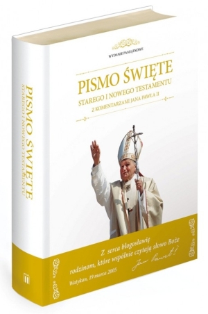 Unikatowa Biblia Papieska z komentarzami Świętego Jana Pawła II jest pierwszym od czasów Biblii Wujka przekładem dokonanym przez jedną osobę. To owoc długiej pracy tłumacza ks. bp. Kazimierza Romaniuka. Jest także duchowym skarbcem Papieża-Polaka, a zarazem niepowtarzalną pamiątką jego kanonizacji. Wydanie tej wyjątkowej Biblii wzbogacono o liczące 320 stron objaśnienia Jana Pawła II. Ponadto na pierwszych kartkach znajduje się błogosławieństwo Ojca Świętego skierowane do rodzin.