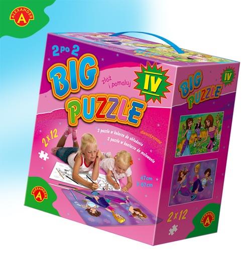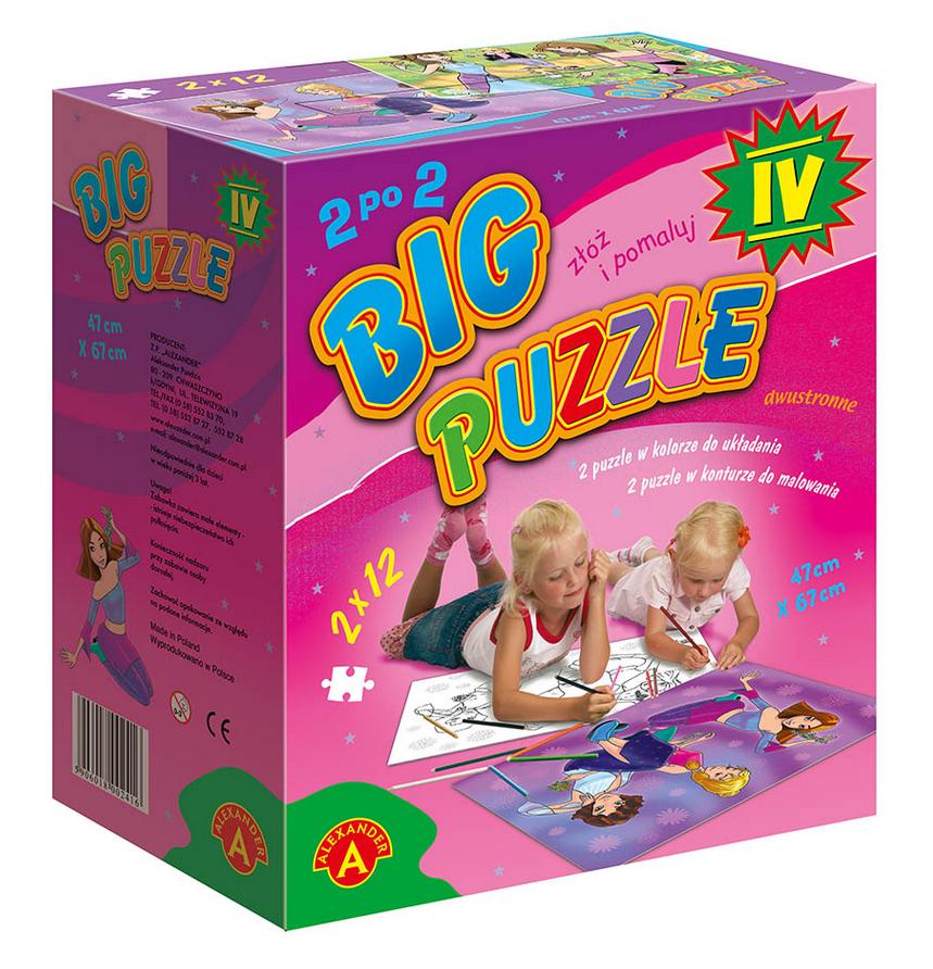 Opakowanie zawiera 2 układanki. Każda układanka jest dwustronna. Z jednej strony znajduje się kolorowy obrazek do układania, z drugiej strony znajduje się konturowy obrazek do układania i kolorowania. Układanki (puzzle) mają wymiar 47 x 67 cm i składają się z 12 elementów. Gra dla graczy w wieku od 4 lat.
