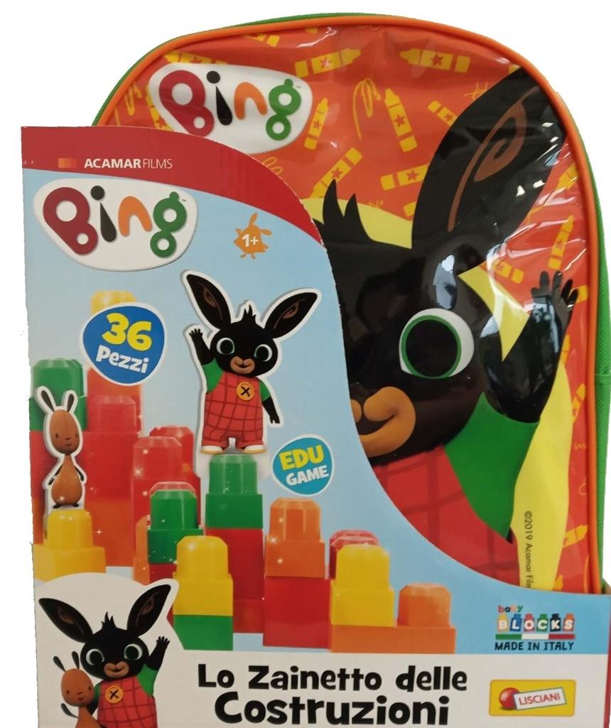 Zestawy zawierający plecak z Bing oraz klocki konstrukcyjne składające się z 72 elementów. Dodatkowo do klocków dołączone są tekturowe elementy samokorygujące, które można umieścić w klockach ze specjalnymi wypustkami.
