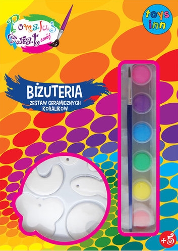 koraliki ceramiczne 18 szt, wstążki 2 szt, farby w 6 kolorach, pędzelek.