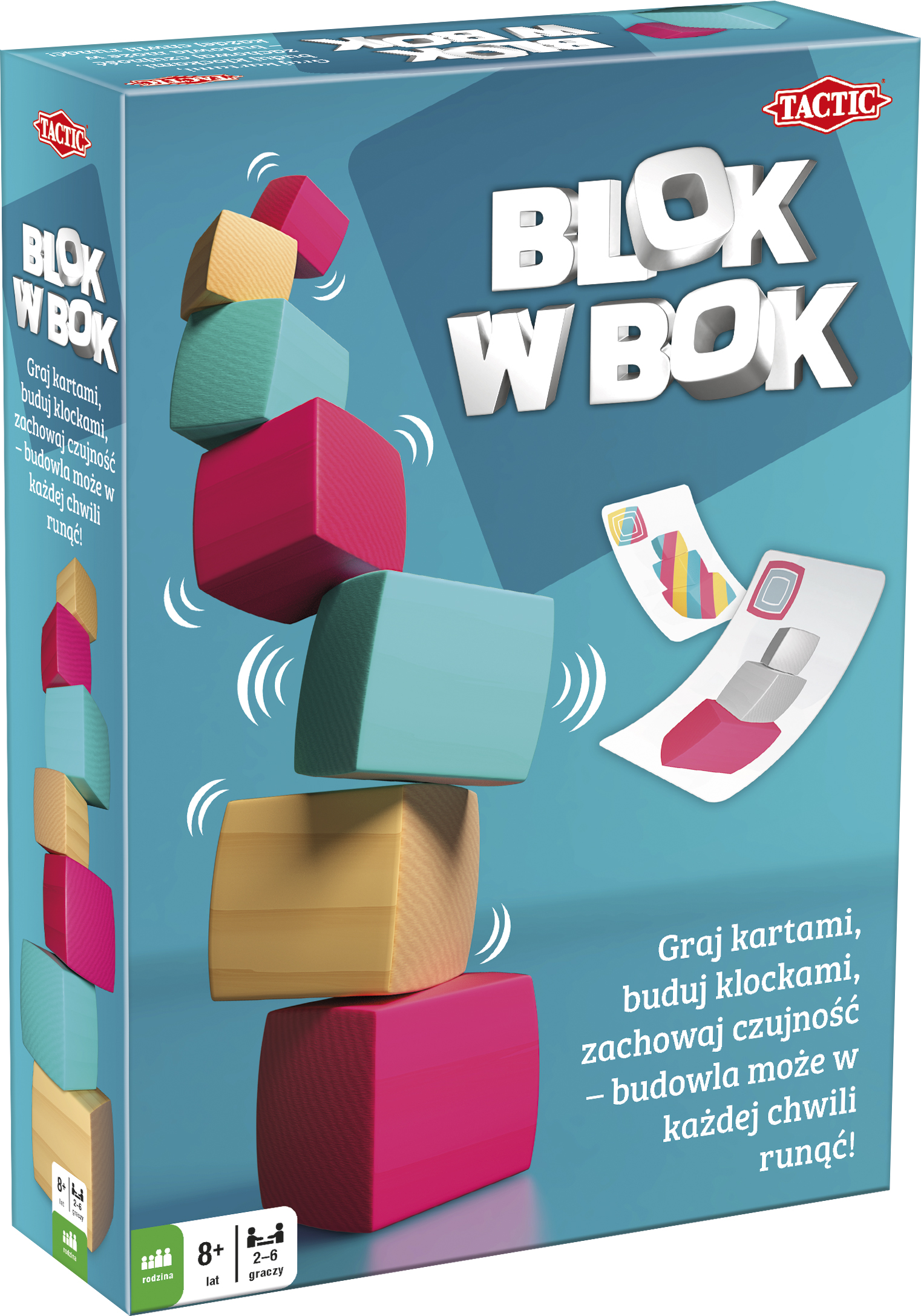 Wydawnictwo: Tactic Rok wydania: 2019 Oprawa: pudełko kartonowe Format: 19.0x26.0cm Kod paskowy (EAN): 6416739559902 Zagraj kartą budowli i połóż odpowiedni klocek na szczycie bądź wykorzystaj kartę akcji. Wygrasz, gdy pozbędziesz się wszystkich kart lub postawisz na wierzchołku wieży dziewiąty klocek. Nie będzie to jednak łatwe? Gdy budowla się zawali, przybędzie ci kart! Zawartość: 9 klocków, 55 kart. Wiek graczy: 8+ Liczba graczy: 2-6 Czas rozgrywki: 20 minut x