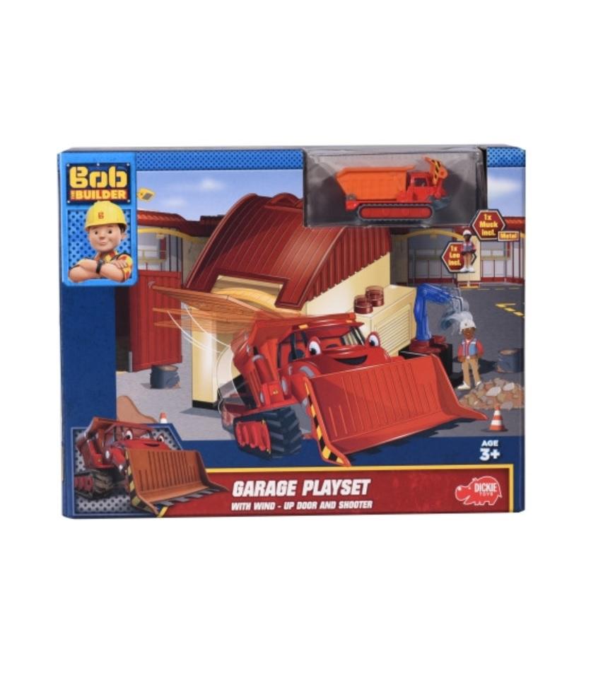 Zestaw z bajki Bob budowniczy zawierający spychacz, kompresor, garaż z podnoszonymi drzwiami i wyrzutnią, figurkę Wendy'ego i inne.