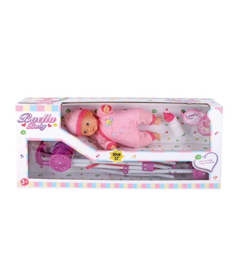 Uroczy bobasek o wielkości 30 cm, wraz z metalowym wózeczkiem na którym możemy wozić naszą lalkę.