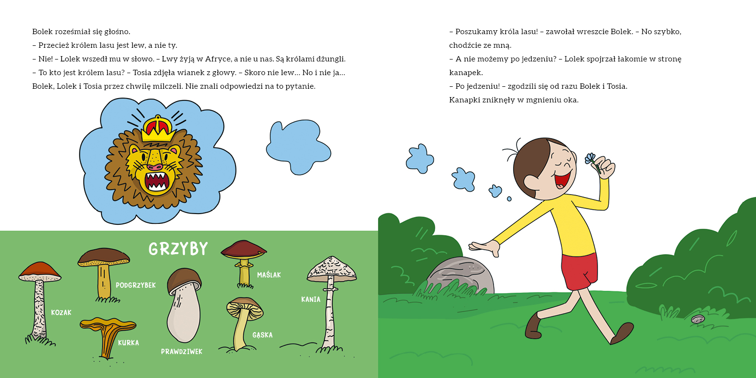 Opis produktuZasady bezpieczeństwa"Poszukamy króla lasu! - zawołał Bolek". Ale kto jest królem lasu? Lwy żyją przecież w Afryce, a nie w Polsce. Przed Bolkiem, Lolkiem i Tosią trudna zagadka do rozwiązania. W lesie dzieci dowiedzą się, czy sarenki mogą jeść muchomory, po co żuk robi kulki z kupy i kto rządzi w mrowisku. W serii "Rosnę z Bolkiem i Lolkiem" ukazały się jeszcze: "Bolek i Lolek i zaczarowana lokomotywa. Bajka o kreatywności" "Bolek i Lolek szukają skarbu. Bajka o wychodzeniu z tarapatów" "Bolek i Lolek i piracka przygoda. Bajka o odwadze" oraz "Bolek i Lolek odkrywają Bałtyk" "Bolek i Lolek poznają sekrety lasu" Na końcu każdego tomu znajdziesz wyjątkową odznakę dla Twojego dziecka! Kilkadziesiąt lat po tym, jak bohaterowie kultowej kreskówki Bolek i Lolek bawili się w Indian, spotkali Yeti, byli na wakacjach i urządzili szalony pościg, ich beztroski świat odżywa na nowo, odpowiadając na potrzeby współczesnych czytelników i czytelniczek. Książki z serii "Rosnę z Bolkiem i Lolkiem" to krótkie, przystępne opowiadania, które krążą wokół tematu podstawowych potrzeb rozwojowych dzieci. Na pierwszy rzut oka wypełniają je po brzegi zmyślne zabawy Bolka, Lolka i Tosi, ale właściwi bohaterowie tych historii skrywają się pomiędzy literami i ilustracjami. Zbierz wszystkie tomy serii! 3+ x