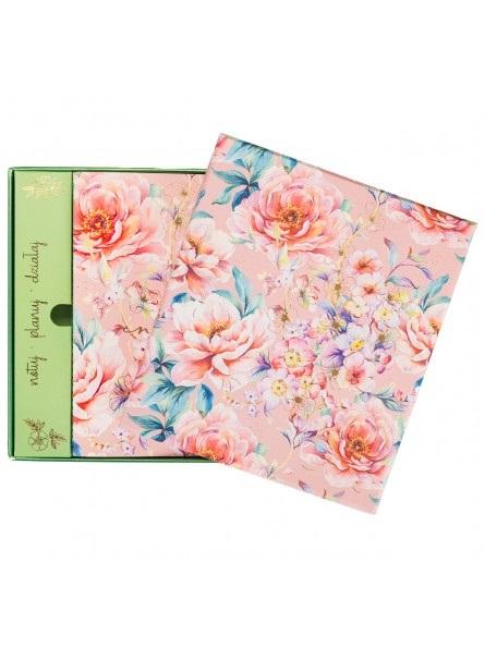 Zestaw prezentowy Wiosna zawiera pudełko upominkowe z wieczkiem ozdobionym motywem kwiatowym z subtelnymi złoceniami oraz idealnie dobranym kolorem metalizowane spody. Wewnątrz pudełka umieściliśmy pięć różnych, starannie dobranych romantycznych notatników. Kwiatowe okładki zdobione tłoczeniami złotą folią, tworzą piękną kompozycję graficzną, a kolorowe przeszycia grzbietów dopełniają wyjątkowy charakter i podkreślają znaczenie detali. Notatniki sprawdzą się jako pamiętnik, szkicownik lub miejsce na wszelkie codzienne notatki.