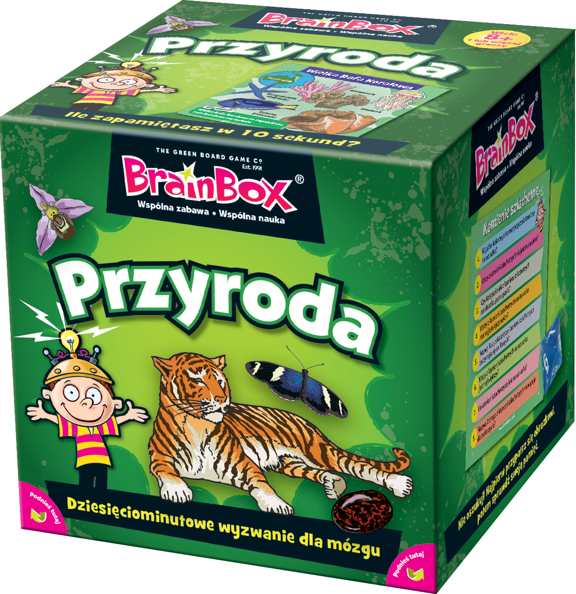 Odkryj przed swoim dzieckiem bogaty świat fauny i flory dzięki grze BrainBox - Przyroda! Na 55 kartach znajdziesz rozmaite rodzaje zwierząt, roślin i grzybów (zarówno powszechnie występujących w okolicy, jak i egzotycznych) z podziałem na gatunki. Dodatkowo na każdej karcie znajduje się przyrodnicza ciekawostka, a sama rozgrywka pozwala ćwiczyć zapamiętywanie i szybkie kojarzenie faktów. Czym jest BrainBox?To seria wyjątkowych gier edukacyjnych, które będą wspierały rozwój Twoich dzieci lub podopiecznych na każdym etapie nauki. Wykorzystując dynamiczną i angażującą zabawę, gry z linii BrainBox pozwalają rozwijać wiedzę, a także wspierają trening pamięci i spostrzegawczości, czyli umiejętności kluczowych dla rozwoju. Każde pudełko to zestaw kart, które po jednej stronie mają obrazek (należy przyjrzeć mu się przez określony czas), a z drugiej zestaw pytań, sprawdzających nie tylko naszą pamięć, ale też wiedzę z zakresu danego przedmiotu. Na czym to polega?