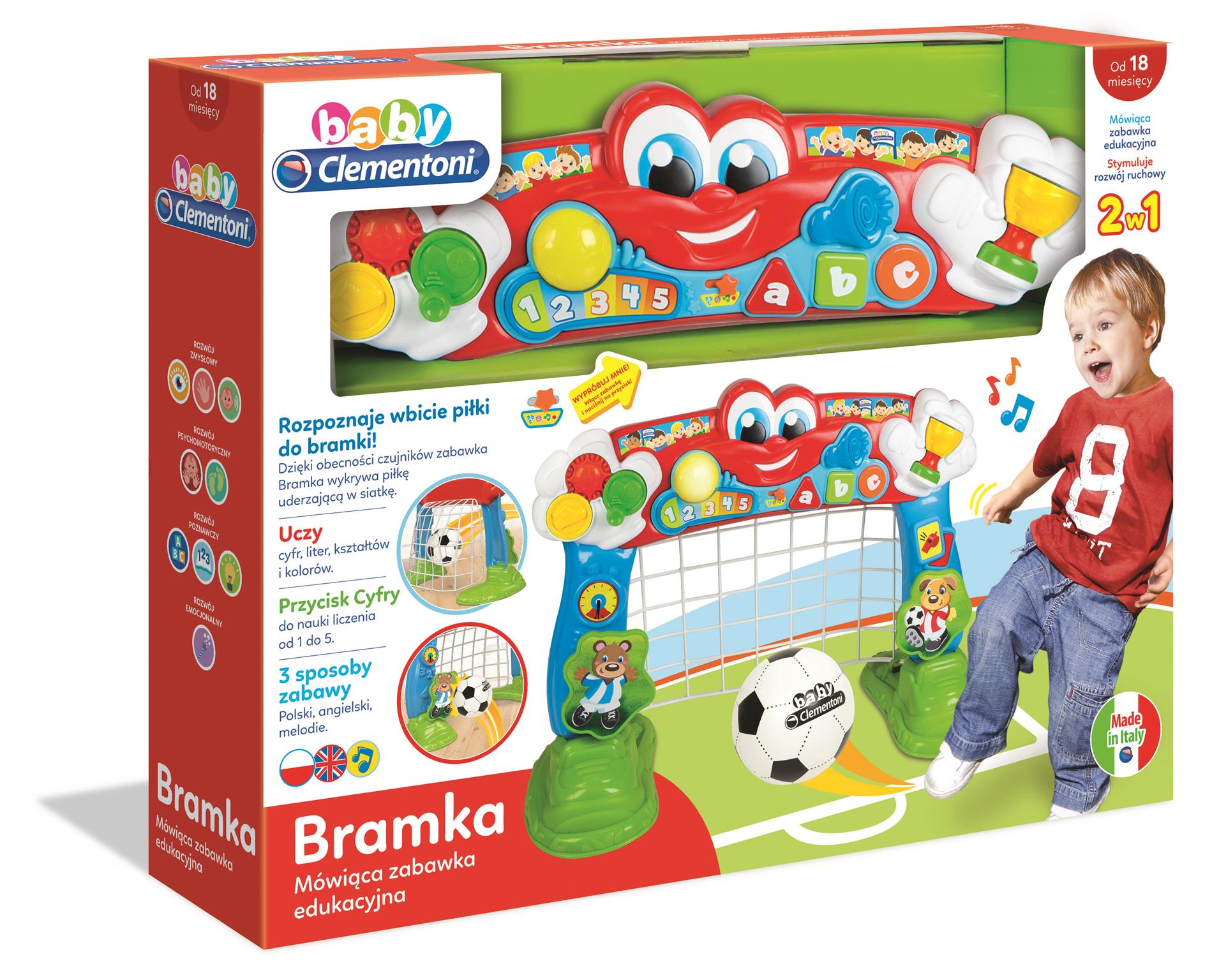 Opis produktuZasady bezpieczeństwaWielofunkcyjna zabawka 2 w 1: można trenować strzały na bramkę i odkrywać bogatą zawartość centrum edukacyjnego. Głośnik edukacyjny uczy pierwszych liter, liczb od 1 do 5, kształtów, kolorów i wielu nowych słów. Rozpoznaje każdy celny strzał. W trybie muzycznym odtwarza wiele radosnych piosenek, zabawnych dźwięków i efektów świetlnych. Uczy w języku polskim i angielskim. Funkcje Try Me - ON / OFF widoczne. Łatwa w montażu. x